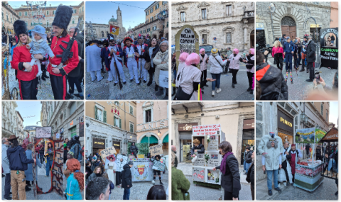 ASCOLI - Il centro storico ride (anche amaro): il Carnevale accende la città, orfana di Piazza Arringo, tra dialetto, bambini in maschera e stoccate all’attualità