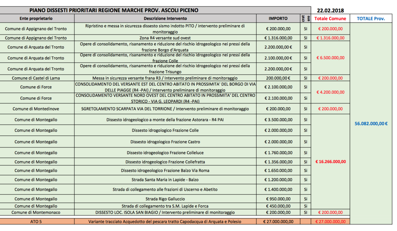 Il piano dissesti prioritari è ripartito nelle tre province colpite dal sisma: 20 interventi per un importo di 29.082.000 euro destinati ad Ascoli Piceno, provincia a cui si aggiungono altri 27 milioni stanziati per gli acquedotti di Arquata del Tronto e Capodacqua. 9 gli interventi nella provincia di Fermo per un totale di 15.790.000 euro. A Macerata 65 interventi per un importo di 104.370.628 euro. Nel caso del Piceno gli interventi riguardano i Comuni di Acquasanta Terme (200.000 euro per intervento nella frazione di Pito), Appignano del Tronto (1.316.000 per la zona R4 versante sud-ovest), Arquata del Tronto (6.500.000 per le frazioni Borgo, Trisungo, Colle, ), Castel Di Lama (200.000), Force (4.200.000 per le frane in prossimità del Borgo di via Piagge e via Leopardi), Montedinove (200.000 per la scarpata di via del Torrione), Montegallo (16.266.000 per le frazioni Astorara, Colle, Castro, Colleluce, Collefratta, Balzo e le strade Santa Maria in Lapide, Santa Maria in Lapide-Forca, Rigo-Galluccio e Uscerno-Abetito), Montemonaco (200.000 per lo studio preliminare del dissesto in località Isola San Biagio) oltre alla variante dell’acquedotto del Pescara nel tratto Arquata-Polesio.