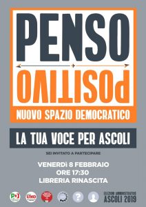 Il centrosinistra ascolano, in vista delle elezioni comunali di maggio, prende a prestito le parole della canzone di Jovanotti, “Penso positivo”, per annunciare il nuovo confronto con i cittadini venerdì 8 alle ore 17,30 nella Libreria Rinascita.