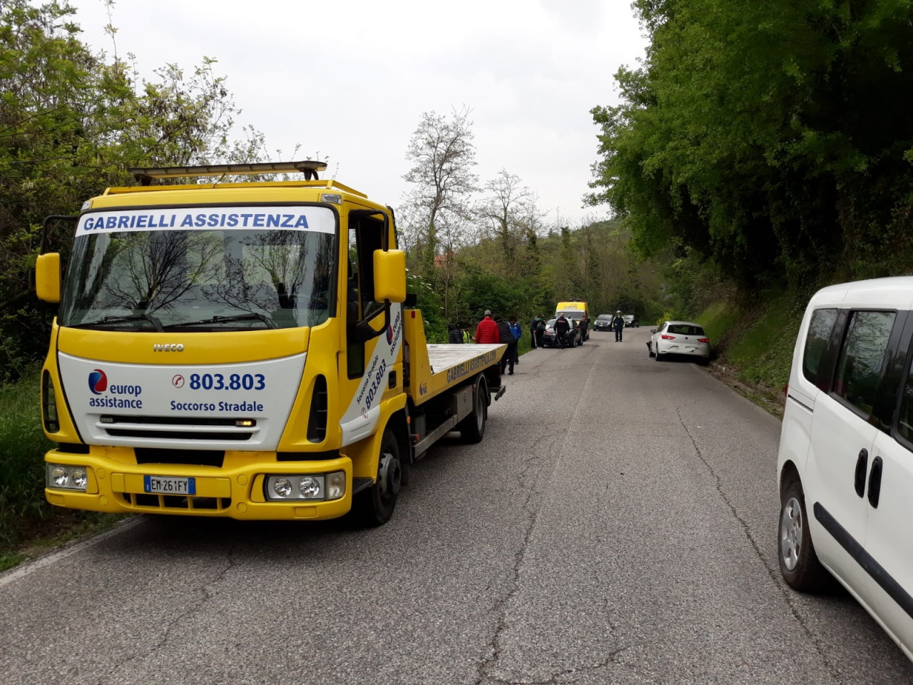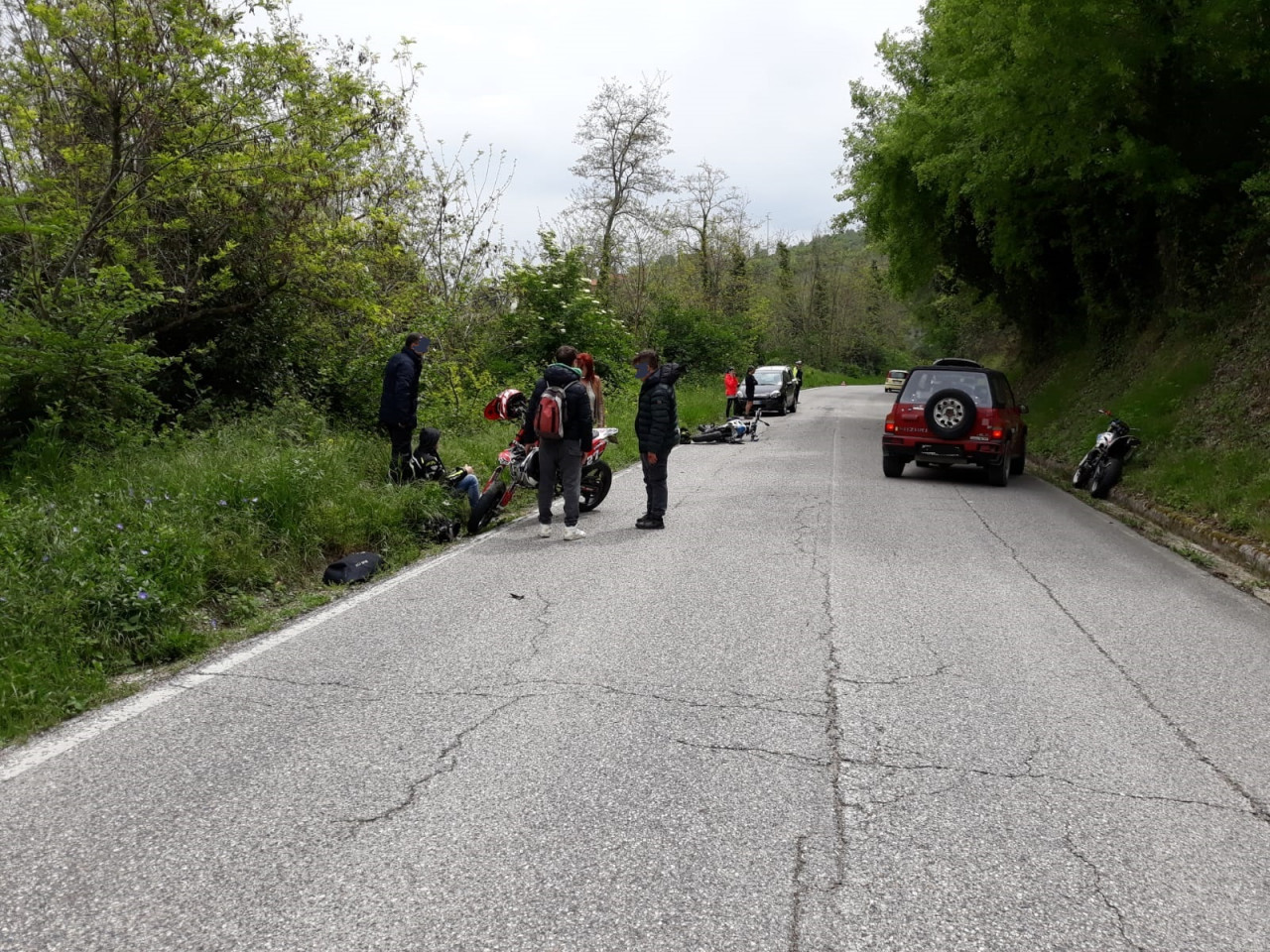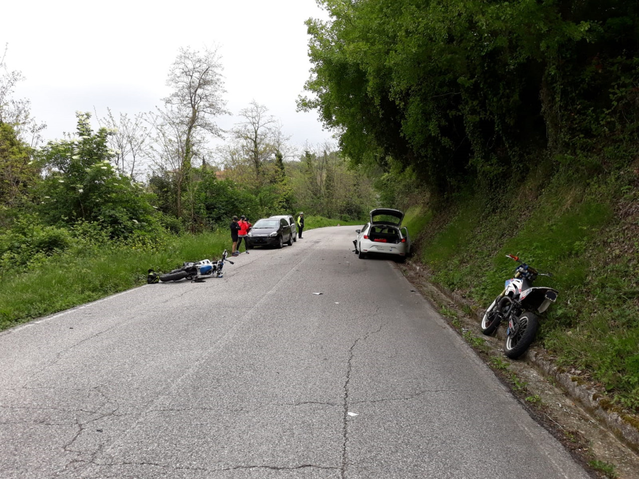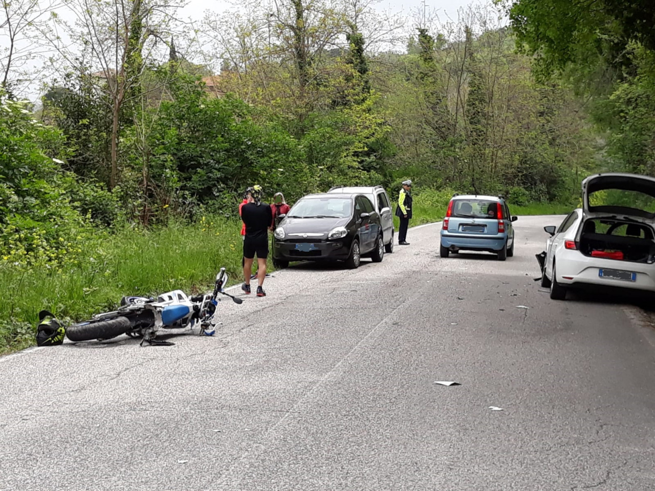 Il luogo dell’incidente con l’auto accostata e la moto a terra, entrambe danneggiate