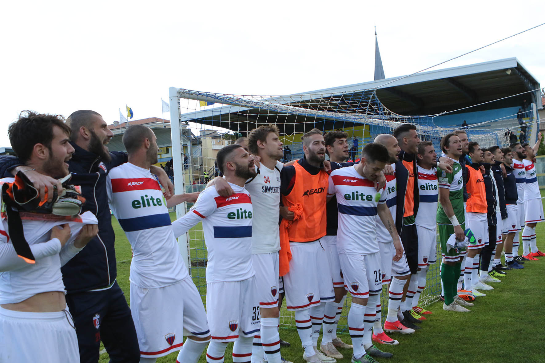I rossoblù al “Recchioni” a fine gara sotto la curva dei tifosi giunti da San Benedetto