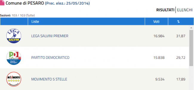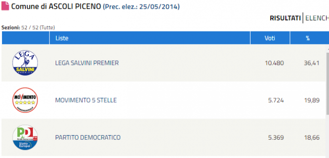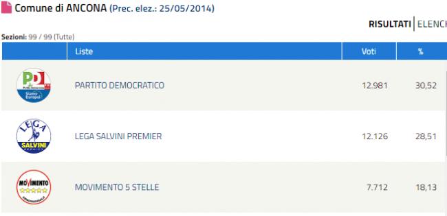 Tra i cinque capoluoghi solo Ancona conserva il primato del Pd. La roccaforte guidata dalla sindaca Valeria Mancinelli porta in dote un 30,51% dei voti per i democrat contro il 28,51 dei leghisti e il 18,13 dei grillini. Pd (18,66%) in coda invece tra le tre principali forze ad Ascoli città dove la Lega raggiunge il 36,41% e il M5s il 19,89%, dati indicativi anche in vista dello scrutinio per le comunali. Anche Pesaro è in attesa dei risultati delle comunali e la situazione del voto europeo vede in testa la Lega con il 31,87% segue il Pd con il 29,72% e il M5stelle al 17,89%. Fermo incorona Salvini al 37,69% , il Pd si ferma al 20,72 e il M5s al 18,62.