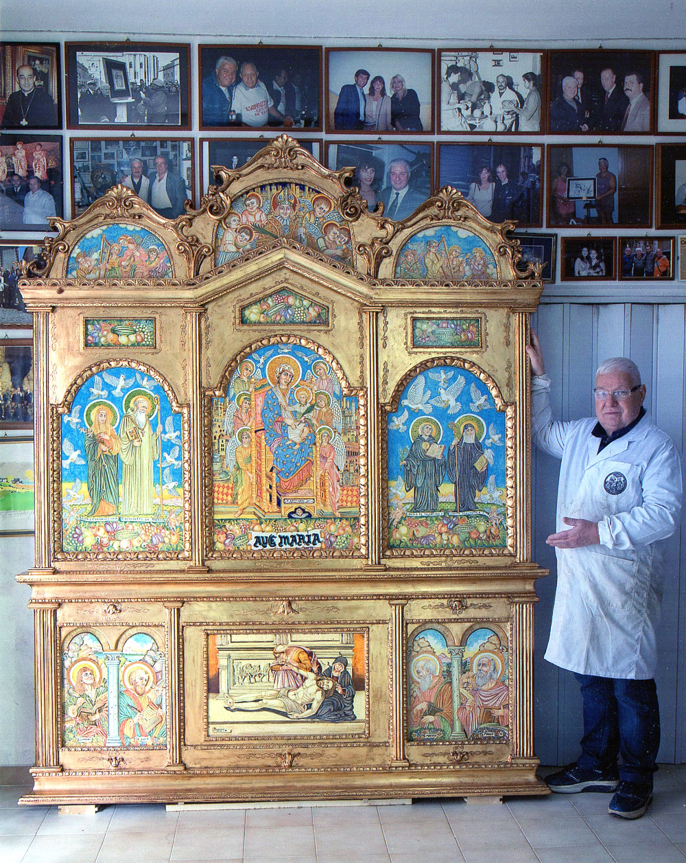 Il Polittico di Cordivani è stato presentato oggi in anteprima agli organi di informazione dallo stesso artista e dalla madre badessa del monastero, suor Sofia Gitahi. La maxi opera, composta da ben dodici maioliche, é dedicata a San Benedetto da Norcia, patrono d’Europa e fondatore dell’ordine monastico, e alla sorella gemella Santa Scolastica. Cordivani, artista poliedrico, conosciuto e apprezzato a livello nazionale, ha raffigurato, oltre ai due Santi, anche i quattro Evangelisti (Giovanni, Marco, Luca, Matteo), una emozionante deposizione di Gesù con la Madonna e la Maddalena, Santa Caterina da Siena (patrona d’Italia e compatrona d’Europa), San Nicola da Tolentino e Sant’Emidio patrono di Ascoli), sullo sfondo le torri e i monumenti del capoluogo piceno. Insomma una grande opera d’arte, in maiolica, impreziosita da una cornice in legno di noce massello e copertura di foglia d’oro.