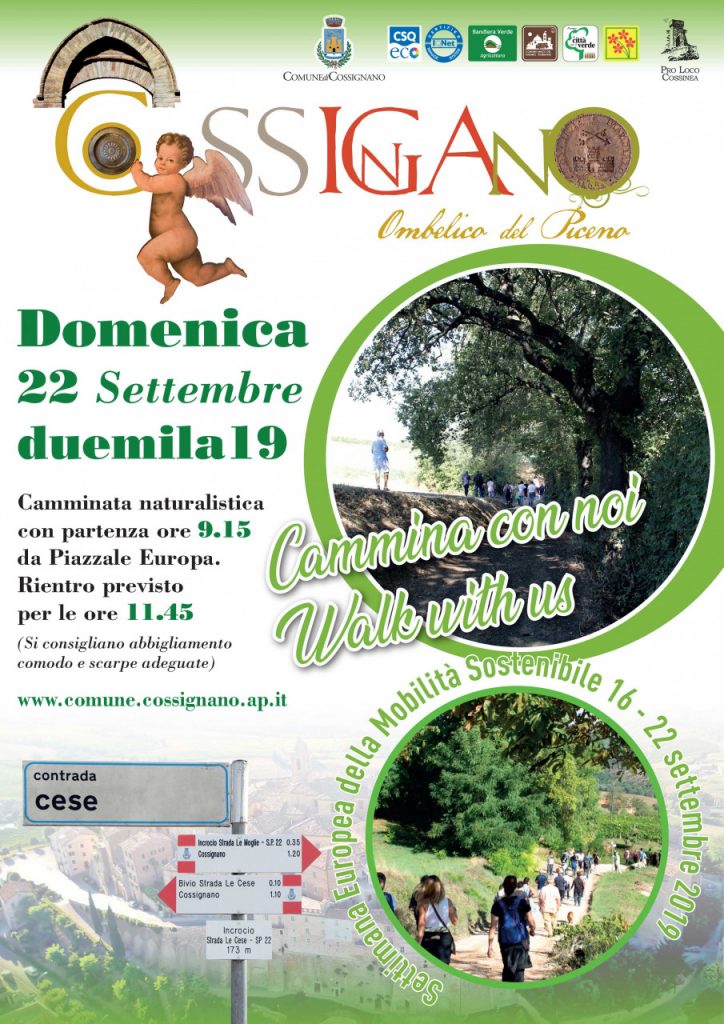 L’Amministrazione comunale di Cossignano ha aderito all’iniziativa, che si svolgerà dal 16 al 22 settembre e che la Regione Marche coordina per dare visibilità unitaria a tutte le iniziative. Domenica 22 settembre, alle ore 9,15 con raduno al piazzale Europa, è organizzata una camminata naturalistica a partecipazione gratuita di circa 6 chilometri alla scoperta del territorio di Cossignano. Il rientro dall’escursione è programmato per le ore 11,45 circa. Gli organizzatori raccomandano l’uso di abbigliamento comodo e scarpe adeguate.