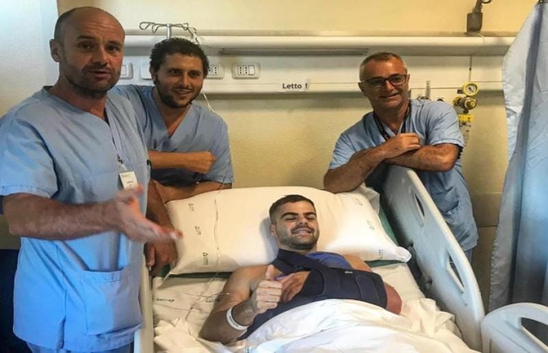 Fenati all’ospedale di Rimini con con gli ortopedici che lo hanno operato (foto da Snipers Team facebook)