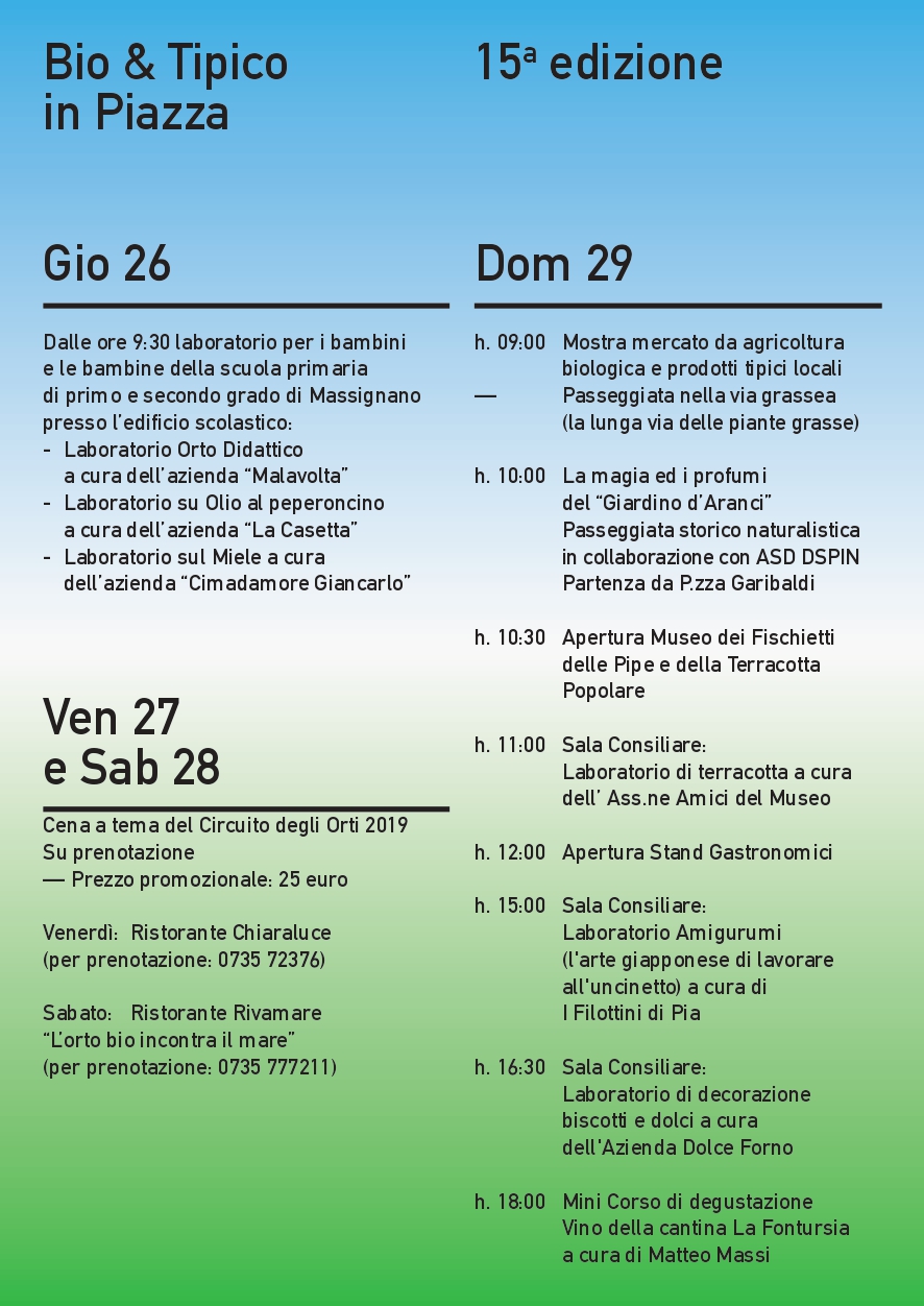 Venerdì 27 settembre cena a tema del Circuito degli Orti 2019 presso il ristorante “Chiaraluce” mentre il giorno successivo si potrà degustare il menù “L’orto bio incontra il mare” presso “Rivamare.