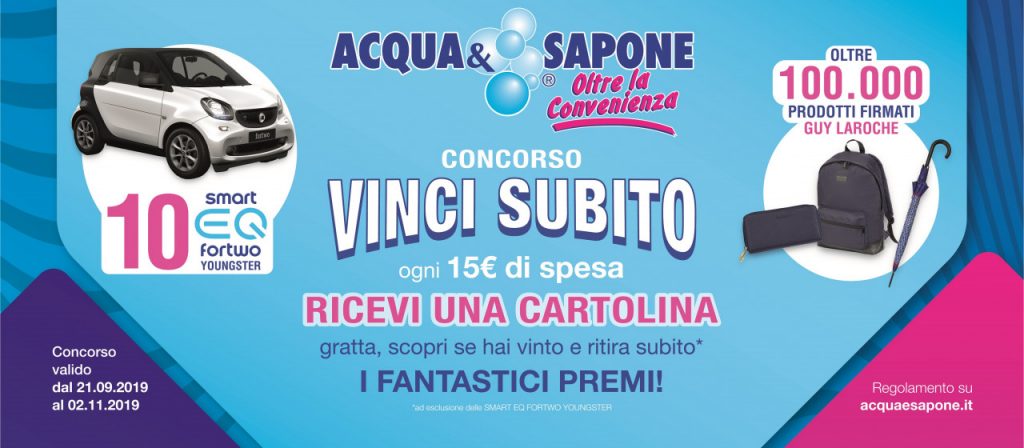 Presente sul mercato dal 1992, “Acqua & Sapone” oggi è la più grande catena della bellezza e dell’igiene. Con una rete di 700 negozi distribuiti su tutto il territorio nazionale grazie alla specializzazione e alla profonda0 conoscenza del settore, “Acqua & Sapone” è in costante crescita e in continuo rinnovamento. Sempre all’avanguardia, propone la più grande varietà di prodotti, competenza e convenienza in ambienti nuovi, moderni e accoglienti. Gli stessi ambienti che fino al 2 novembre 2019 accolgono il nuovo concorso “Vinci subito”. E in palio ci sono premi ambìti ed esclusivi come ben dieci auto Smart “Fortwo Youngster” elettriche EQ su cui è ricaduta la felice scelta della catena. E proprio questa mattina è stata vinta la prima delle dieci “Smart” in palio. La fortunata è una signora, cliente del punto vendita di Chiari, in provincia di Brescia.