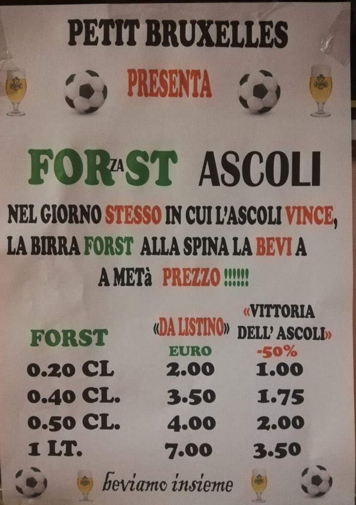 Un locale da sempre molto frequentato dai tifosi bianconeri. Cosa ha escogitato il tuitolare Nico Ferretti? Quando l’Ascoli vince… la birra Forst alla spina costa la metà. Una iniziativa promozionale davvero originale e simpatica, che sicuramente coinvolgerà tanti tifosi dell’Ascoli che sperano di festeggiare la vittoria dell’Ascoli bevendo birra con gli amici. A cominciare magari proprio da Ascoli-Cosenza