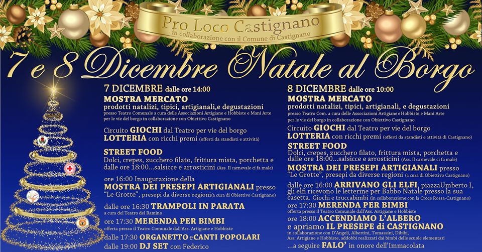 Il varo del ricco programma si avrà il 7 alle 14 con con il lancio della mostra mercato con prodotti tipici, oggetti natalizi e degustazioni, che si terrà al Teatro Comunale. Alle 16 ecco la “Mostra dei presepi artigianali” presso Le Grotte, con creazioni provenienti da tutta Italia, mezzora più tardi il Teatro del Ramino darà vita a “Trampoli in parata”, alle 17,30 spazio merenda per i bimbi, organetto e canti popolari e, a concludere, il dj set di Federico fissato per le 19. Per tutto il pomeriggio sarà possibile anche fruire delle bontà dello street food, di giochi itineranti e lotterie.