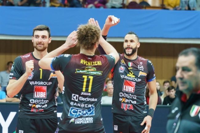 CUCINE LUBE CIVITANOVA: Anzani 12, Kovar 13, D’Hulst n.e., Marchisio (l), Juantorena 18, Massari n.e., Leal 2, Rychlicki 14, Diamantini n.e., Simon n.e., Bruno, Bienek 10, Balaso (l). All.: De Giorgi.