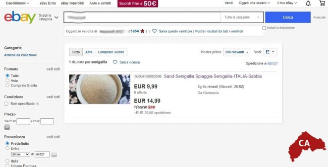 L’annuncio su “eBay” della sabbia di Senigallia messa in vendita online