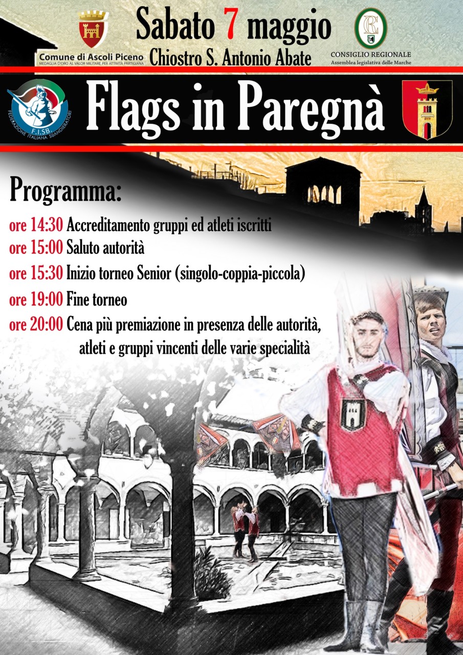 Si svolge domani, sabato 7 maggio, con inizio alle ore 14,30, ad Ascoli, nel Chiostro di Sant’Antonio Abate, adiacente il Sestiere di Porta Tufilla (via Amadio), la prima edizione del torneo sbandieratori e musici “Flags in Paregnà”.