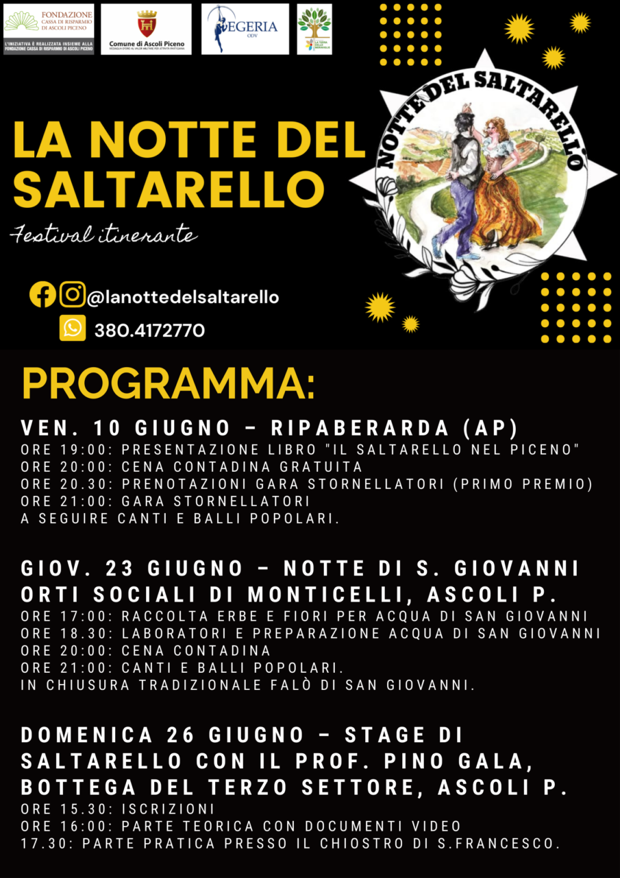 Giornata finale domenica 26 giugno con lo stage di saltarello tenuto dal professor Pino Gala, in partenza alle 16 alla Bottega del Terzo Settore di Ascoli, con parte pratica che si terrà, sempre tra le cento torri, al Chiostro di San Francesco.