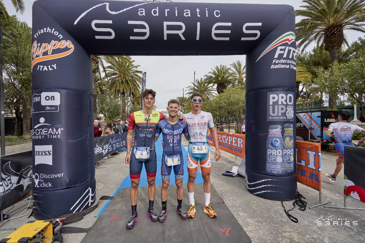Tra gli uomini al termine dei primi 5.000 metri a piedi sono entrati insieme in zona cambio Riccardo Ridolfi ed Elia Zenobi, poi in bici si è scatenato Ridolfi che ha fatto il vuoto arrivando in T2 con un netto vantaggio, consolidato anche nella terza frazione, trionfando in 52’57” con quasi un minuto di vantaggio su Daniel Casadei, terzo a 12 secondi Thomas Burr.