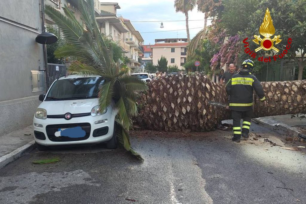 Attimi di paura nel tardo pomeriggio di oggi, 23 agosto, a Porto d’Ascoli, San Benedetto, in via Rossetti,  dove una palma alta circa dieci metri è caduta da un giardino privato finendo su una Fiat Panda parcheggiata lungo la strada. La violenza dell’impatto ha spostato l’auto, causando ingenti danni materiali.