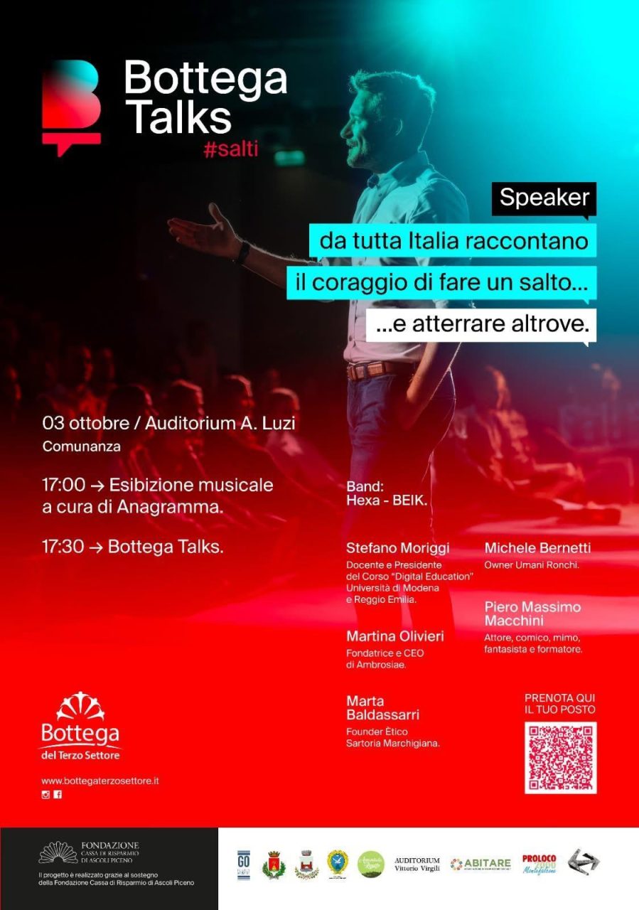 I cinque speaker della serata: Piero Massimo Macchini – attore e comico, tra sorrisi e riflessioni profonde; Martina Olivieri – Ambrosiae, imprenditoria coraggiosa e innovativa nel mondo dell’alimentazione naturale; Marta Baldassarri – Etico Sartoria Marchigiana, creatività, sostenibilità e inclusione sociale; Stefano Moriggi – filosofo e divulgatore, riflessioni su digitale e intelligenza artificiale; Michele Bernetti – CEO dell’azienda vinicola Umani Ronchi. Storie diverse, unite da un filo comune: il coraggio di fare un salto.