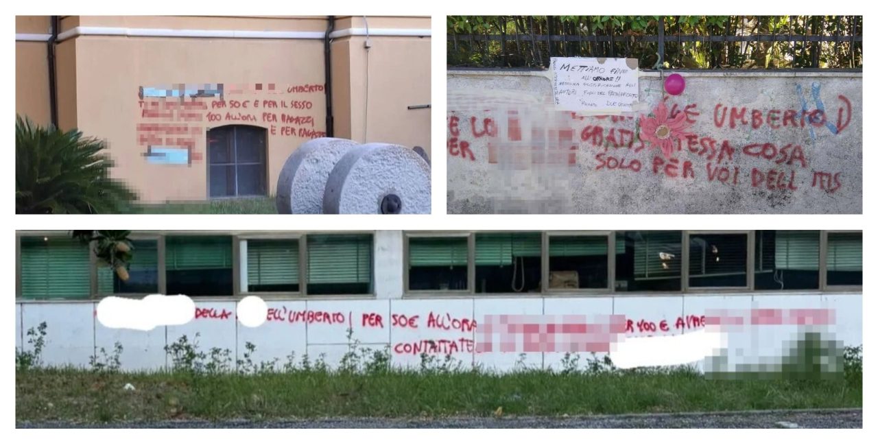 Dopo le ignobili scritte apparse per ben tre volte suoi muri dell’istituto “Umberto I” (leggi qui), che hanno preso di mira una studentessa attraverso epiteti e frasi volgari con tanto di nome e cognome bene in evidenza ed appellativi non da terzo ma da quarto mondo, ecco che i nostri impavidi eroi (o una persona sola, non lo sappiamo) sono tornati a colpire: stamattina, lunedì 6 ottobre, ad essere imbrattati sono stati i muri e i dintorni di altre scuole, ovvero l’istituto “Fermi” (le scritte compaiono sulla casa di fronte) e l’agrario “Ulpiani” in viale della Repubblica, il liceo “Orsini” e la sede del “Trebbiani” in via Faleria. Una vera e propria scia, stavolta, e non un caso isolato.