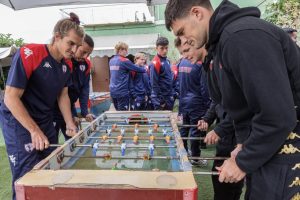 Rappresentanti di Ascoli e Samb giocano a biliardino a margine del pranzo organizzato dalla Diocesi (foto Emanuele Santori)
