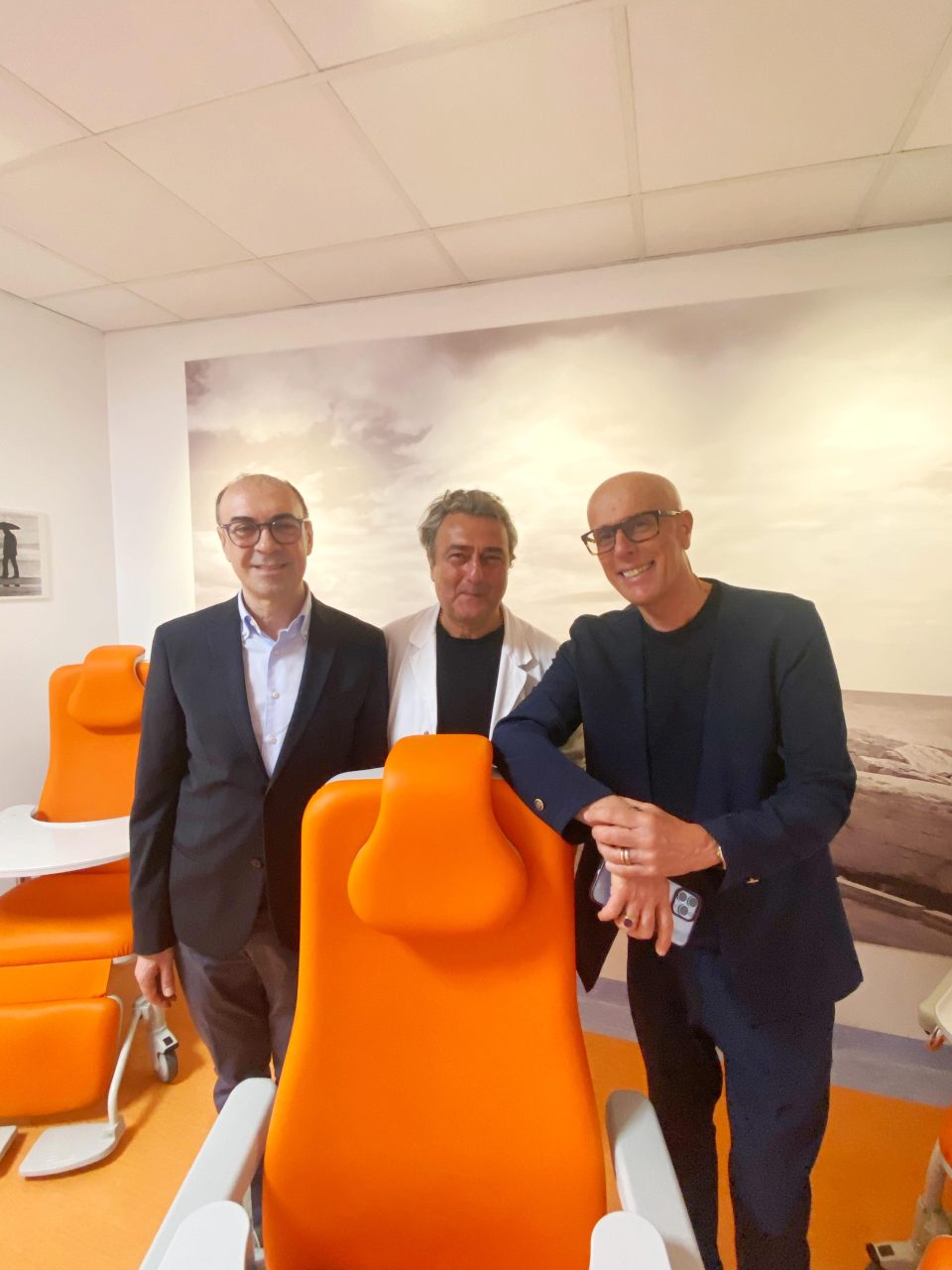 Piero Infriccioli, primario di Geriatria del Madonna del Soccorso, tra Donati e Maraldo, con le poltrone donate dalla Banca del Piceno