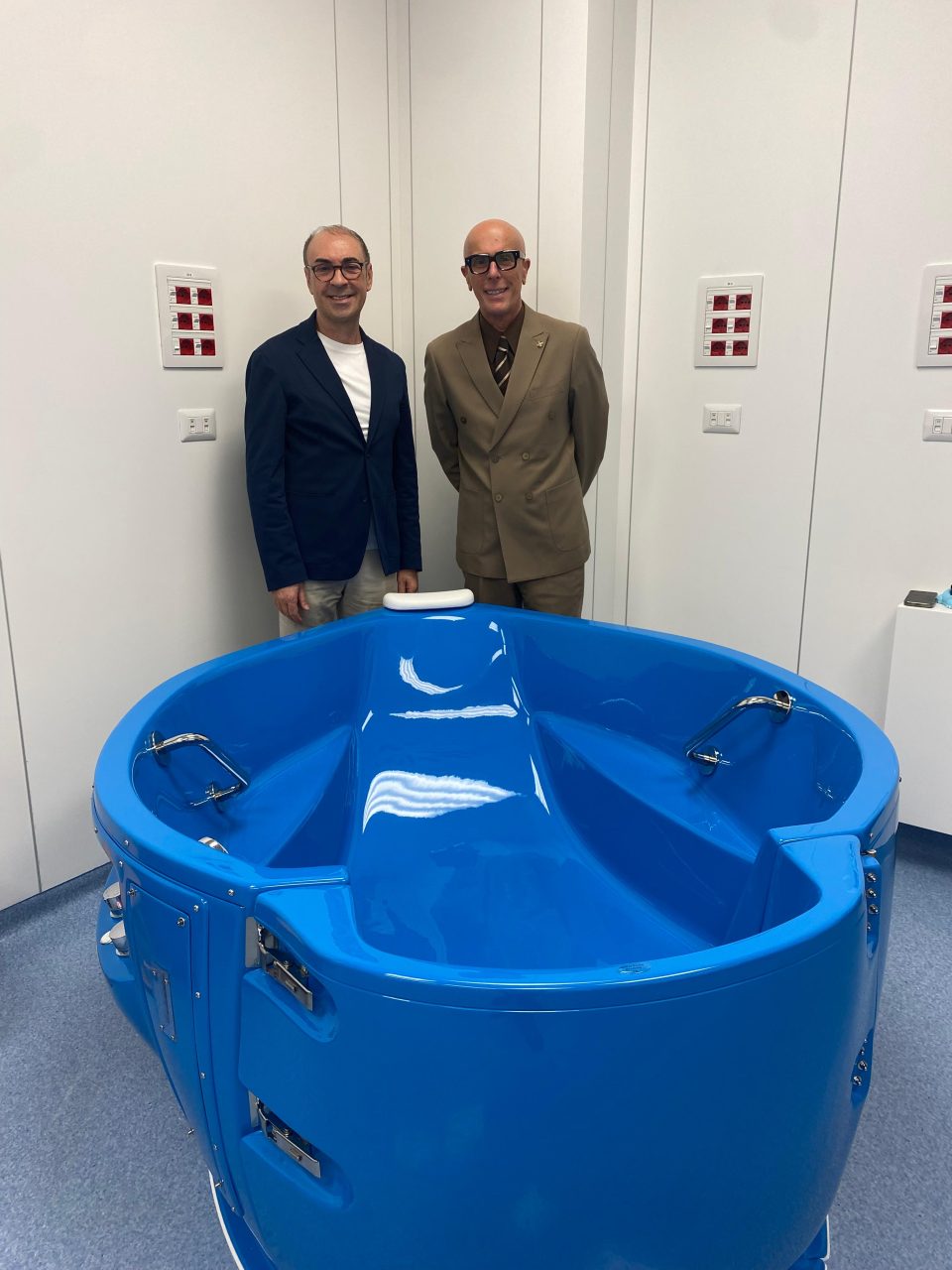 Sandro Donati e Antonello Maraldo dietro alla vasca per il parto in acqua