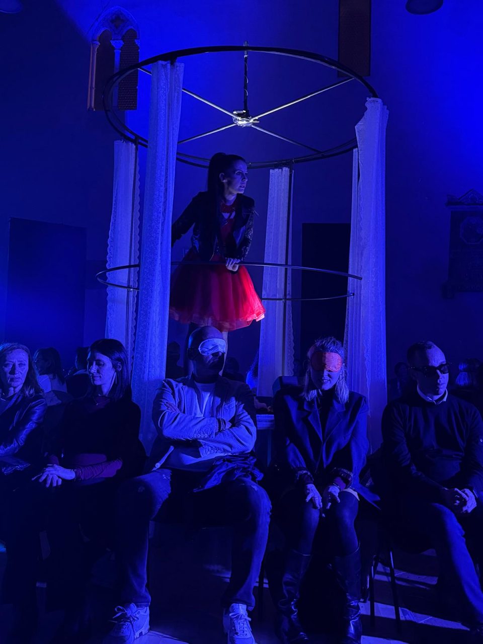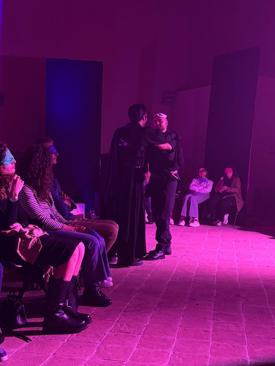 L’assenza della vista svela ciò che spesso l’occhio non coglie: la vibrazione delle parole, il respiro profondo, la paura, il tremolio del desiderio. L’elemento più suggestivo dell’intero allestimento è la disposizione spaziale della scena: le sedie degli spettatori e gli oggetti necessari alla rappresentazione sono disposti in un doppio cerchio concentrico, a formare, viste dall’alto, un grande occhio. Un occhio simbolico, che contiene il pubblico al suo interno e lo trasforma in parte integrante dello sguardo collettivo. È un’immagine di straordinaria potenza: il teatro che vede attraverso chi ascolta, un occhio che si apre proprio nel momento in cui cala il buio. La geometria circolare abbatte le gerarchie tra palco e platea, annulla la distanza, rende tutti – attori e spettatori – parte dello stesso organismo sensoriale.