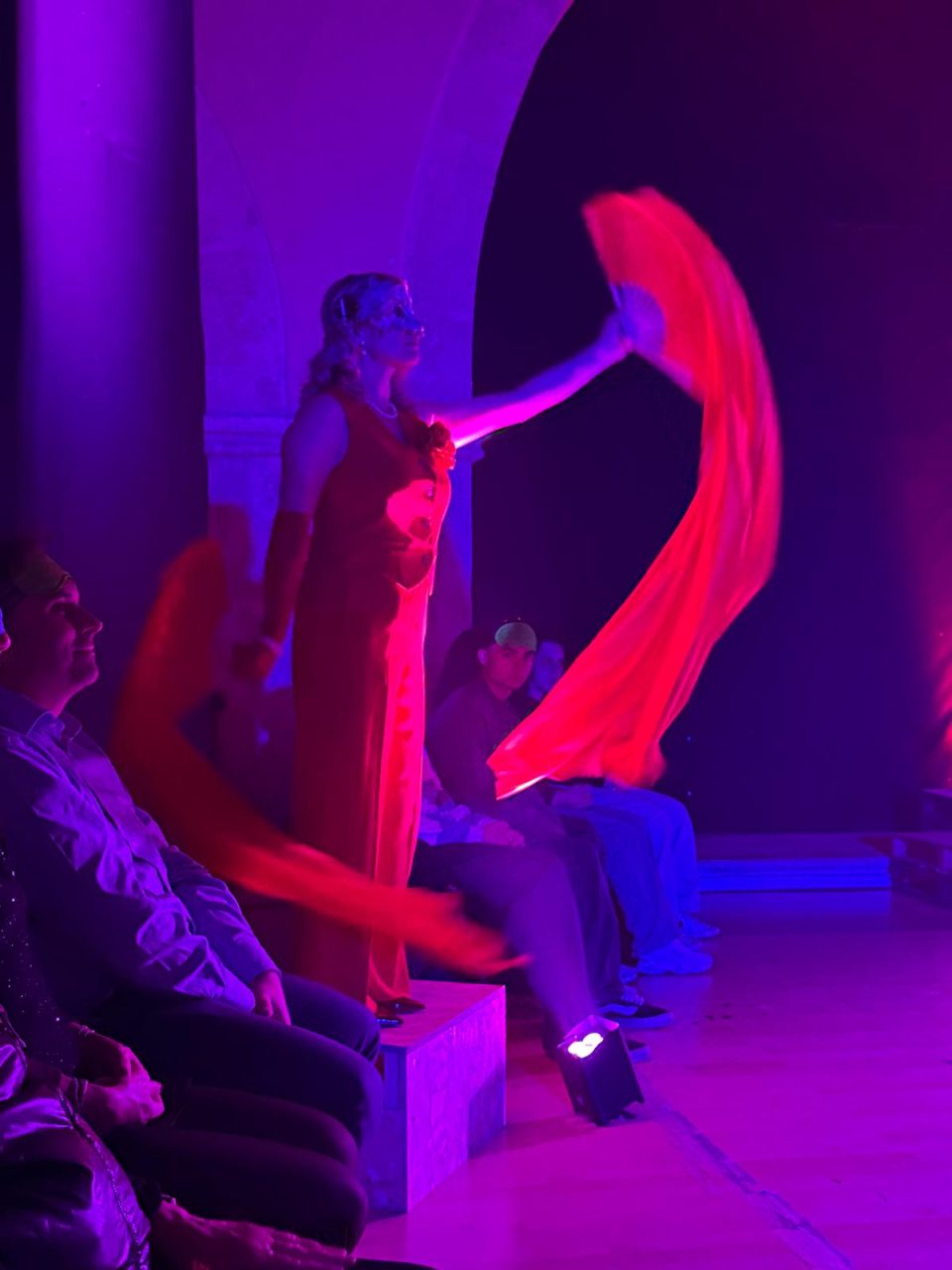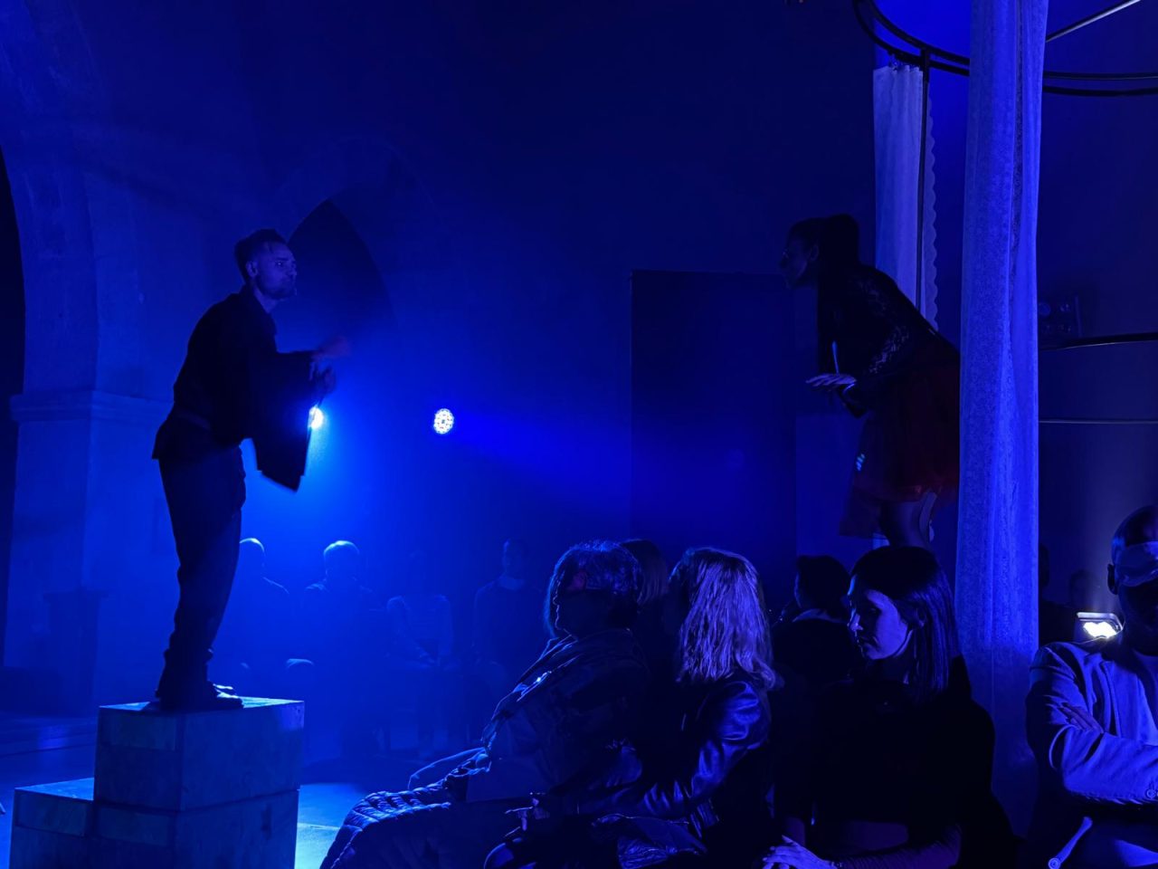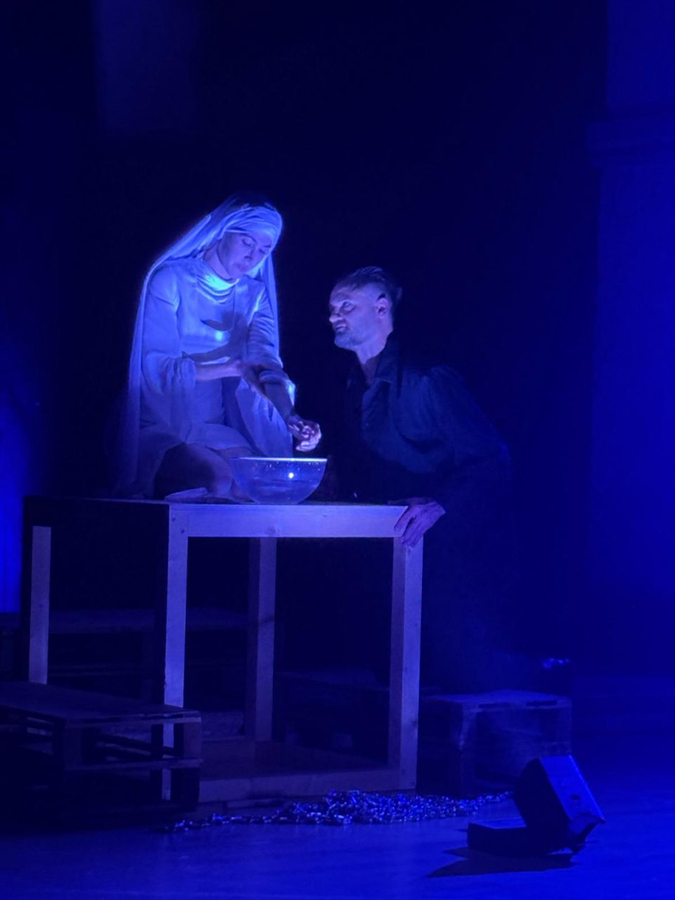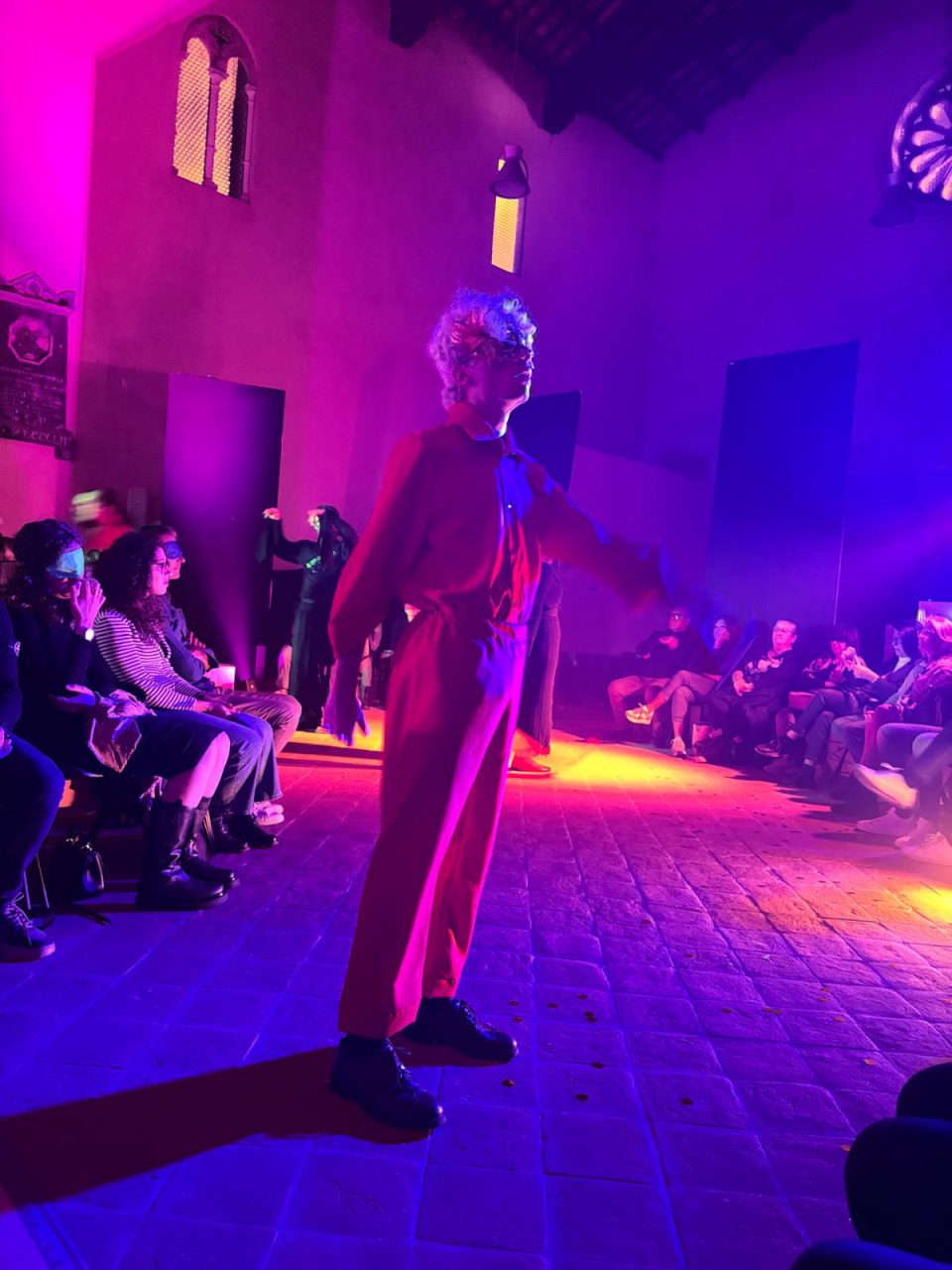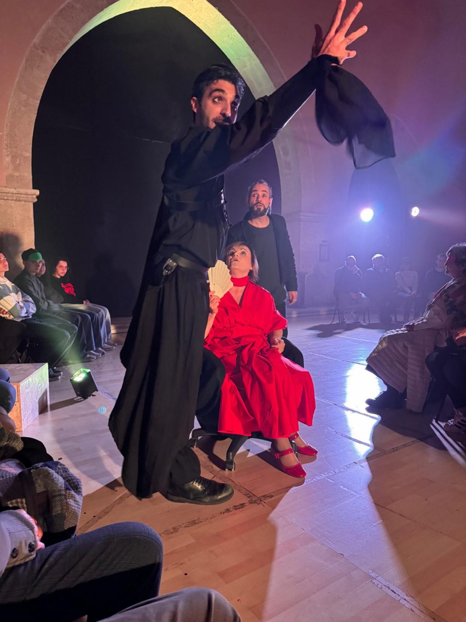 Lo spazio di San Pietro in Castello amplifica inoltre la magia. Le sue mura antiche, il travertino bianco, e la volta alta risuonano come strumenti naturali. Ogni voce, ogni passo, ogni eco trova una sua profondità unica. I suoni diventano architettura, l’acustica si fa drammaturgia. A tutto questo si aggiungono gli odori: i profumi intensi per evocare il balcone dell’amata, l’aroma dolciastro dell’incenso per accompagnare la notte. È una vera e propria sinestesia teatrale, in cui ogni senso collabora alla costruzione del significato.