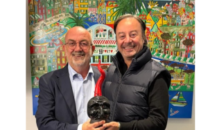 SCARAMANZIA Che Vittorio Massi sia scaramantico è cosa nota, e ovviamente anche Luigi Rapullino, amministratore delegato di Sideralba, main sponsor della Samb e di origini napoletane, non poteva essere altrimenti. Rapullino ha così regalato a Massi un grande corno per tenere alla larga la sfortuna, con la maschera di Pulcinella come base.