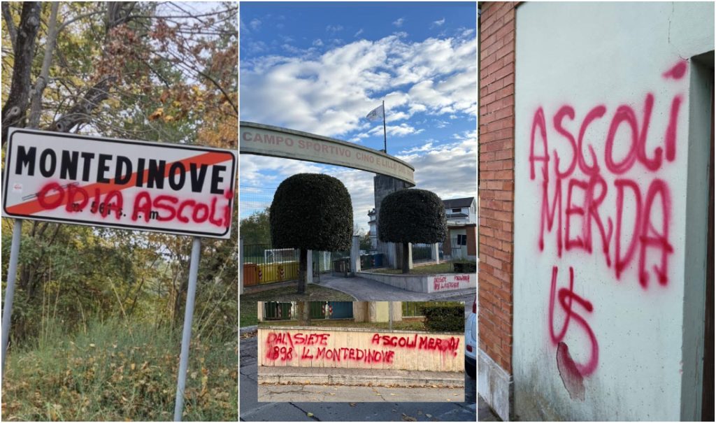 A Montedinove, comune a nord di Castignano tra Rotella e Montalto, nei giorni scorsi sono comparse su muri, cartelli stradali e sul parco “Cino e Lillo Del Duca” scritte offensive e incitanti all’odio verso Ascoli, nel focoso clima che sta precedendo il derby contro la Samb di domenica. Episodi simili si sono verificati, inoltre, sia ad Ascoli che a San Benedetto, con insulti da ambio le parti, per una specie di partita della maleducazione a colpi di bombolette spray.