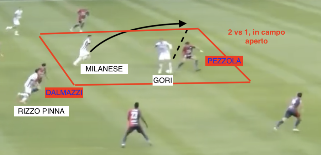 Quando Damiani calcia la palla verso Rizzo Pinna rompendo le linee, Dalmazzi, difensore centrale della Samb, capisce subito tutto: sta già correndo verso il centrocampista ex Cosenza. Ma il giocatore dell’Ascoli è abile a eluderlo con un solo tocco di palla. È qui che la retroguardia della Samb, scoperta, salta definitivamente: la coppia di centrali rossoblù è “spezzata”, Pezzola si ritrova a dover fronteggiare, da solo e da ultimo uomo, un 2 contro 1 con Gori e Milanese, che prima aveva portato fuori posizione Candellori – liberando Rizzo Pinna – e ora corre nello spazio.