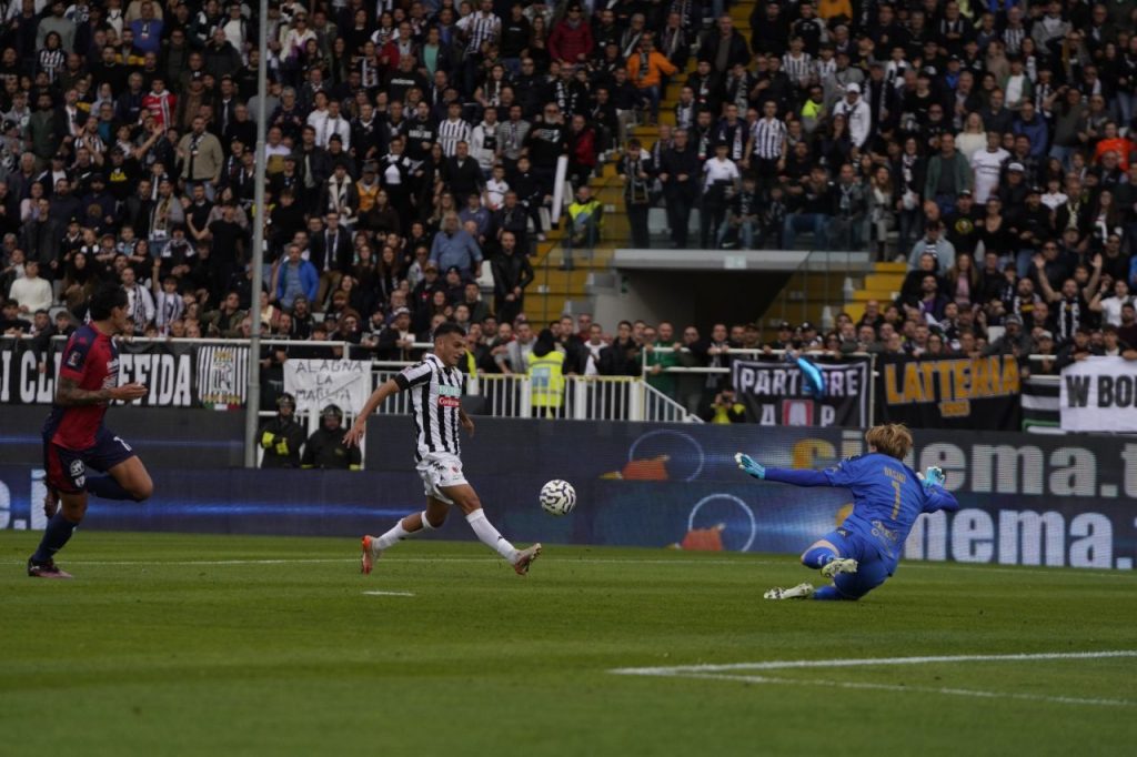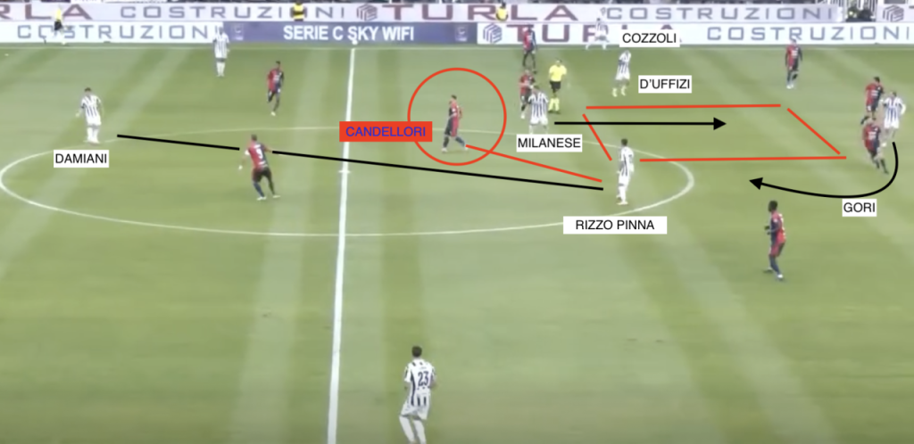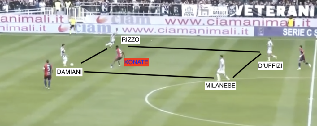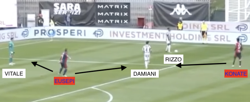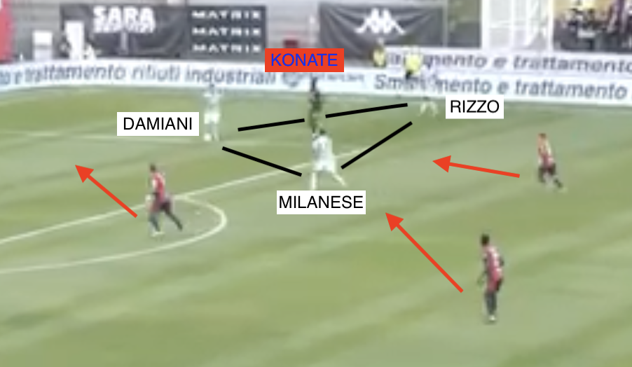 Damiani e Rizzo, a quel punto, hanno vita più facile: con un gioco ormai rodato di continui scambi corti, al quale si aggiunge anche Milanese, i bianconeri creano un 3 contro 1 isolando Konate. Lo scopo? Attirare la pressione rossoblù (foto).