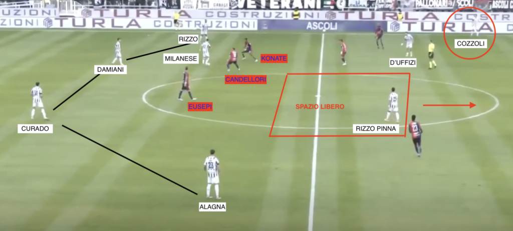 I tre centrocampisti salgono senza palla e portano via il pressing, intanto Vitale torna a sinistra e dialoga ancora con Rizzo. L’Ascoli ha risolto il rebus: dall’angolino di sinistra dove erano chiusi, grazie ai movimenti senza palla e alla costruzione dal basso, i bianconeri ora possono impostare in totale serenità a ridosso del centrocampo.