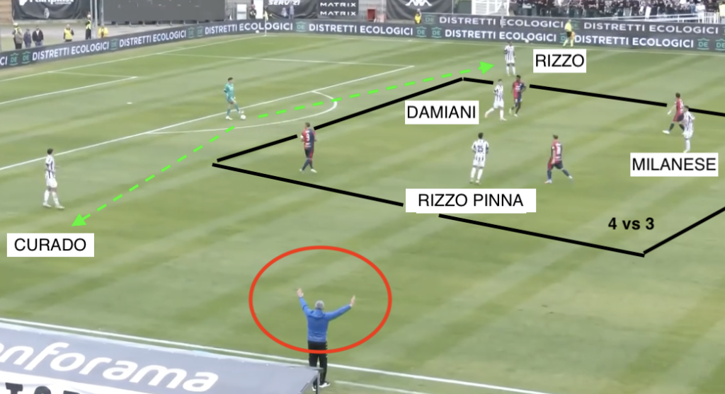 Al fraseggio partecipa anche Vitale – «È lui il nostro primo play», diceva Tomei in conferenza – che, ora libero da Eusepi, può avanzare palla al piede e permettere alla squadra di risistemarsi. Quando la sfera arriva al portiere, Tomei prima indica la corsa a Rizzo Pinna per andare a occupare – intasare – la zona centrale di campo, poi alza entrambe le braccia come a dire “ok, stop, ci siamo, ora possiamo andare con calma” (foto): Curado e Rizzo – destra e sinistra – sono liberi. Il Picchio può iniziare ad impostare dopo essersi liberato dalla prima pressione.