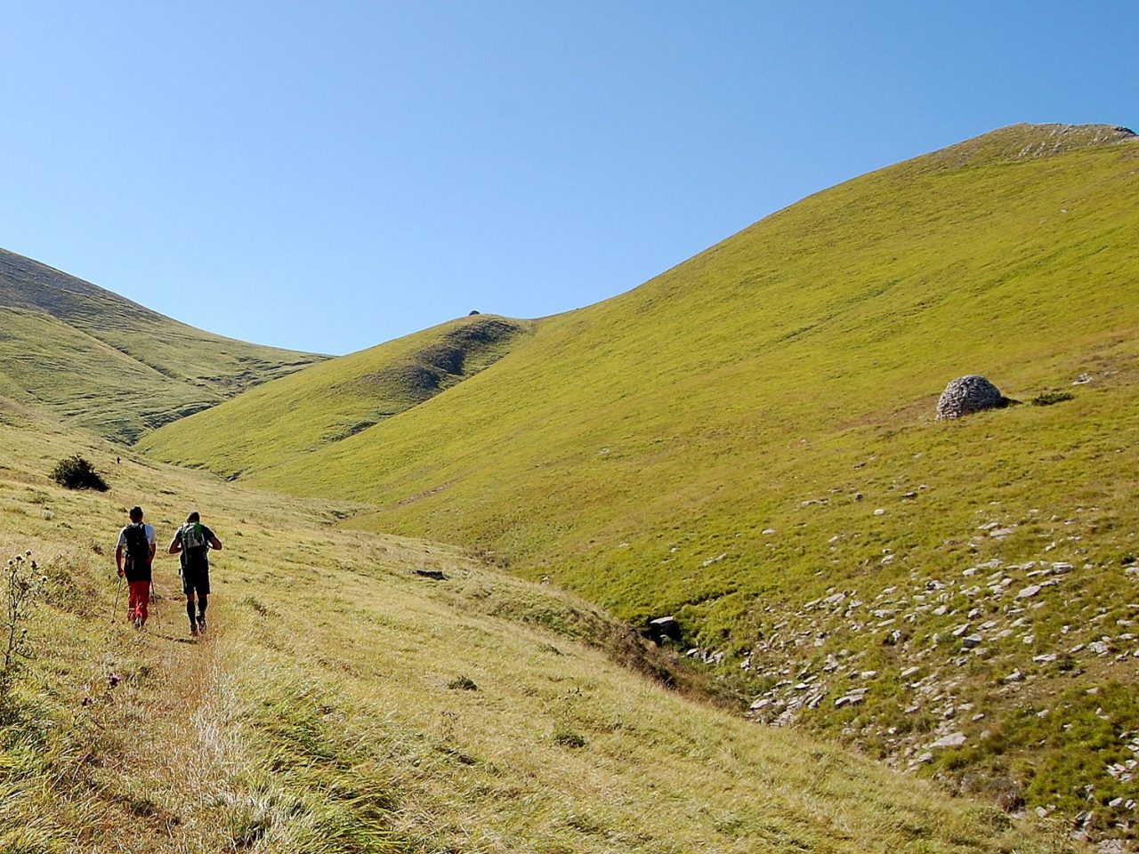La “caciara” di Colle San Giacomo, una delle meglio conservata con, sullo sfondo, il Vettore; in basso, quella a La Croce con, sullo sfondo, l’Ascensione