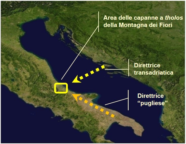 Nella mappa satellitare, sono evidenziate l’area di diffusione delle capanne a tholos della Montagna dei Fiori e le due probabili direttrici di diffusione (nella penisola italiana) del modello architettonico della capanna in pietra a secco