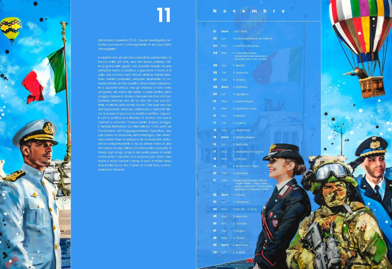 Nell’introduzione, il Comandante Generale invita a guardare al nuovo anno con fiducia e responsabilità, dedicando l’opera “a chi fa progetti di vita, non di morte. A loro offriamo il costante impegno, l’incessante dedizione, in una parola: la cura”.