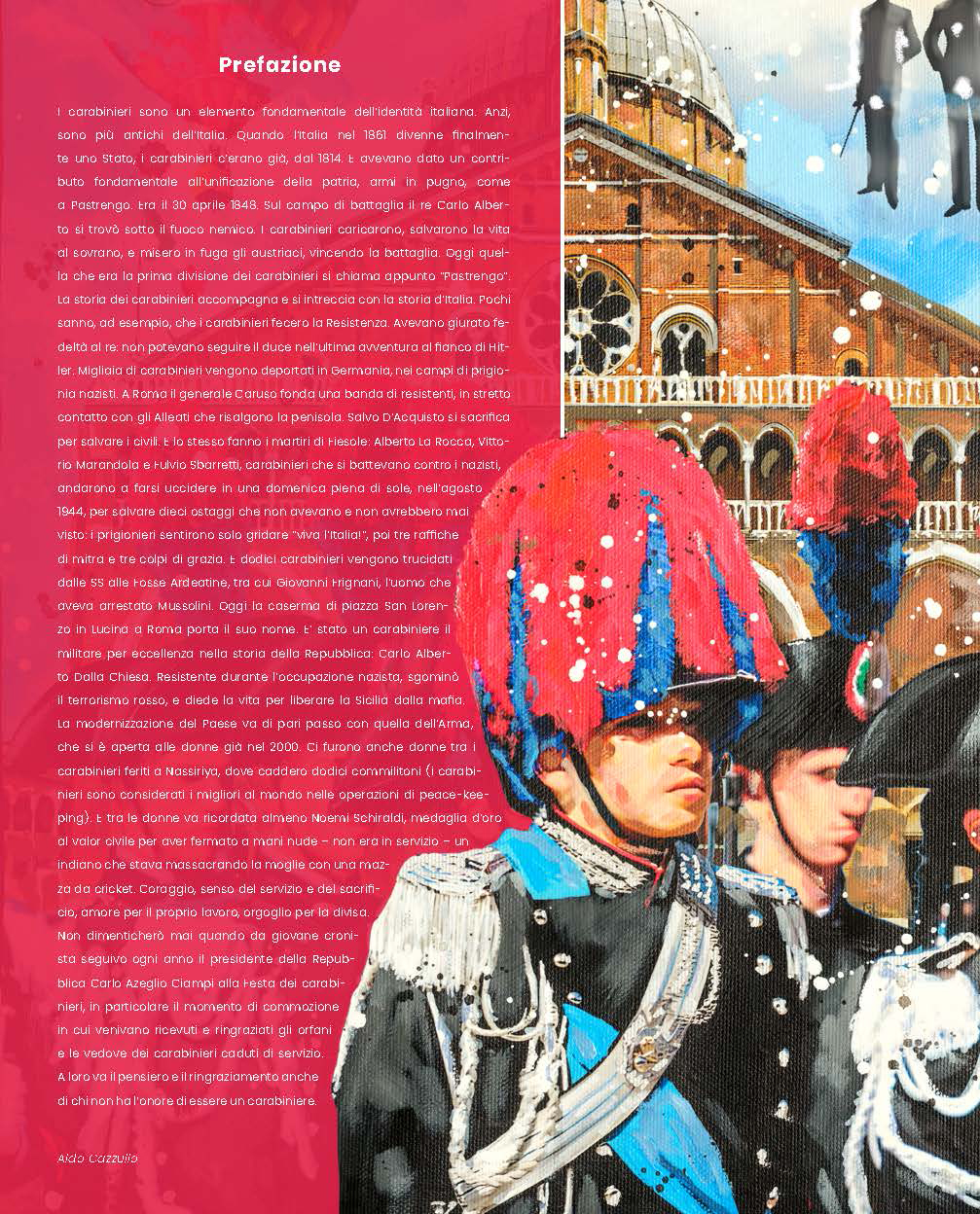 La prefazione, firmata da Aldo Cazzullo, ripercorre la storia dell’Arma dal 1814 a oggi, ricordando i Carabinieri che hanno attraversato le vicende fondative della Nazione, dal Risorgimento alla Resistenza, fino alla contemporaneità, testimoniando unità, sacrificio e senso dello Stato.