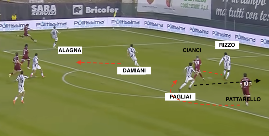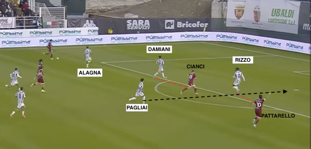 Tutto parte dunque dal centrocampista, che avrebbe dovuto “restare incollato” a Cianci permettendo a Rizzo di andare su Pattarello. In attesa di Pagliai. Ma Damiani sbaglia lettura e tutto il resto accade a cascata. Quando parte il cross, il 4 bianconero è nella terra di nessuno, Rizzo è su Cianci – ma di spalle a Pattarello – e Pagliai sta rientrando, con la postura rivolta verso il pallone. Per il 10 amaranto è un gioco da ragazzi mandarlo fuori tempo per poi colpire, con grande qualità, al volo (foto).