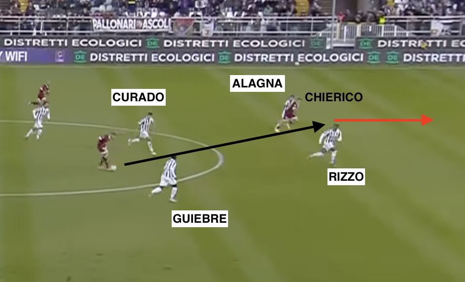 L’errore è concettuale: Damiani, ritrovatosi a fare il centrale, guarda la palla e non gli uomini. O meglio, si preoccupa degli avversari accorrenti al limite dell’area, perdendosi Cianci – con cui aveva iniziato la corsa a inizio azione – alle sue spalle, che viene preso da Rizzo. Rizzo che però, dato il ritardo di Pagliai, si ritrova su due uomini: Cianci e Pattarello, che arriva a fari spenti dalla sinistra.