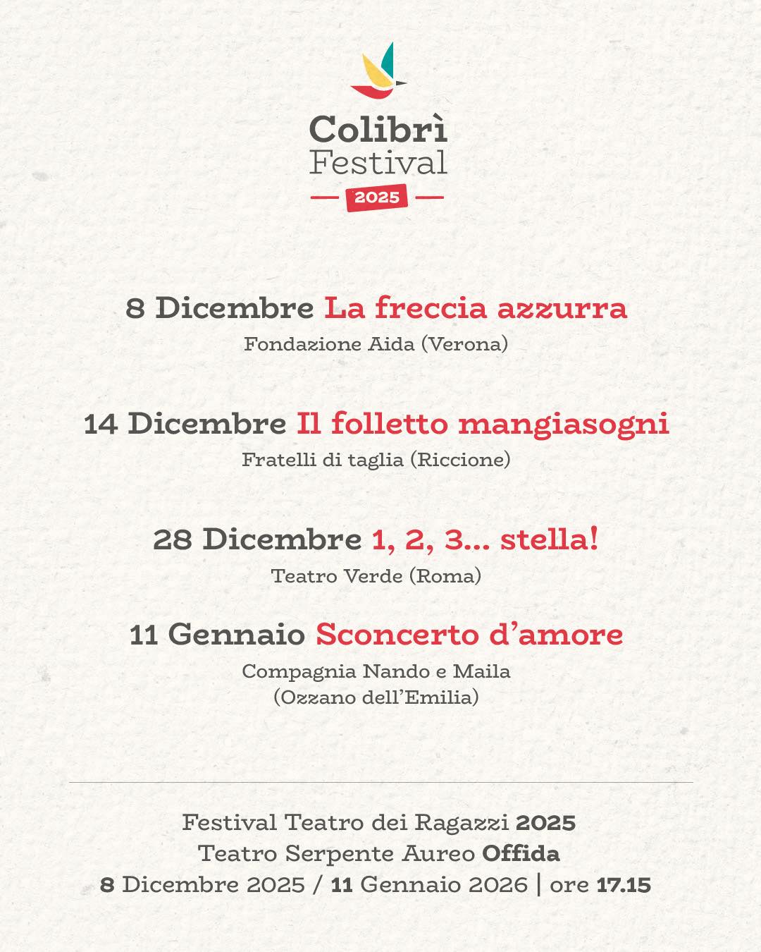 A Offida la cultura è un lavoro paziente, che punta a far sedimentare nel tempo il seme della curiosità, dell’ascolto e dell’immaginazione. Il Colibrì Festival, rassegna di teatro per famiglie e ragazzi ospitata nello scrigno del Teatro Serpente Aureo, è una delle espressioni più chiare di questo impegno: partire dai bambini per costruire benessere culturale, e quindi una città più coesa, più accogliente, più viva.