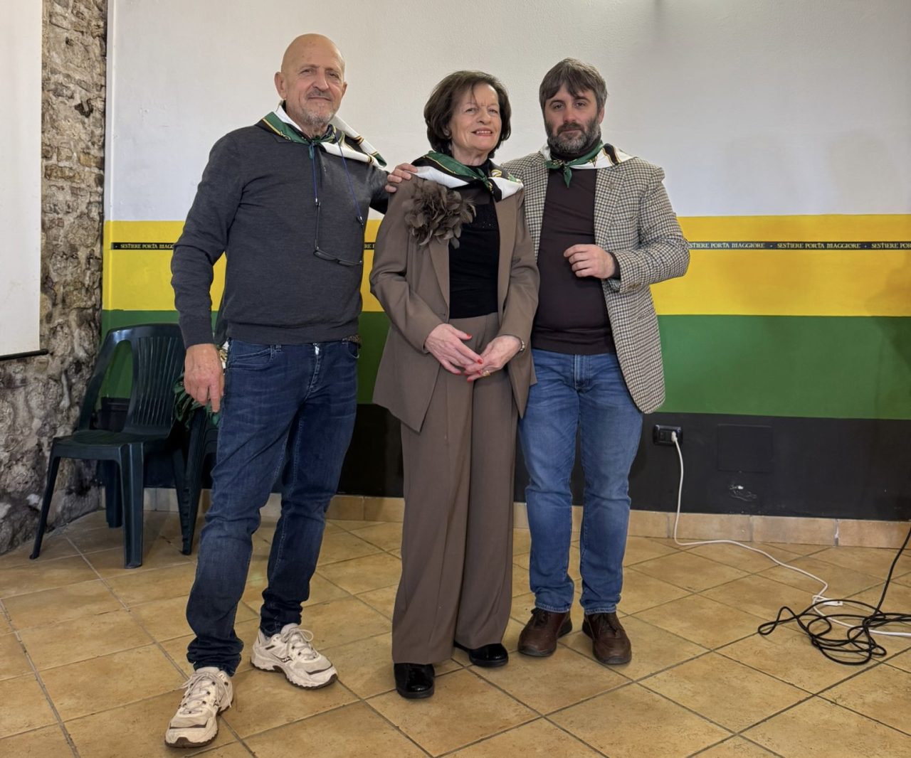In sala anche per la decana delle dame neroverdi, Gianfranca De Angelis. Accanto a lei, una figura iconica come Adriana Federici, prima paggetta del Sestiere nel 1957 e poi dama. Tra le partecipanti, anche Pirjo Orvokki Reinikainen, dama che accompagnò Porta Maggiore alla vittoria del Palio nel 1982.