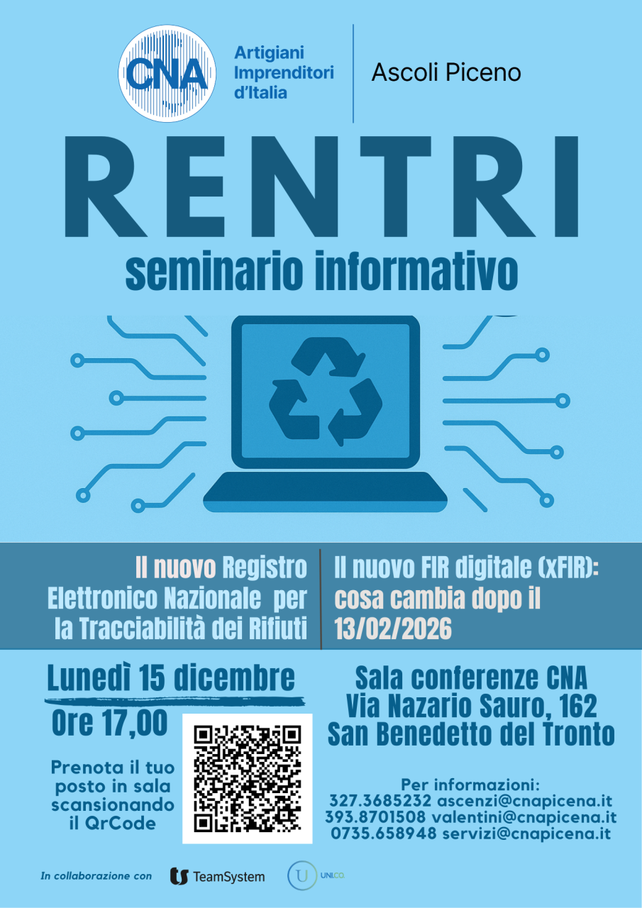 A partire dalle ore 17, nella sala conferenze della sede CNA di San Benedetto (via Nazario Sauro, 162), professionisti ed esperti del settore condivideranno con la platea un’ampia panoramica sul mondo dei rifiuti e sulle novità introdotte dal Rentri, approfondendo nel dettaglio tutti i risvolti pratici legati alla gestione dei rifiuti aziendali.