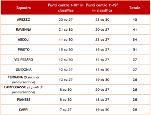 Il confronto con Arezzo e Ravenna, le due battistrada, è emblematico. Gli amaranto hanno costruito il primato grazie a un rendimento molto più equilibrato, con 20 punti contro le prime dieci e 23 contro le restanti, mentre il Ravenna ha addirittura fatto leggermente meglio negli scontri di vertice (21 punti) rispetto a quelli contro la parte bassa (20). Anche il Pineto, con 15 punti raccolti su 30 a disposizione, ha performato meglio del Picchio.