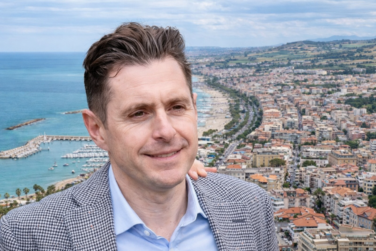 Marco Fioravanti e alle spalle una immagine panoramica di San Benedetto