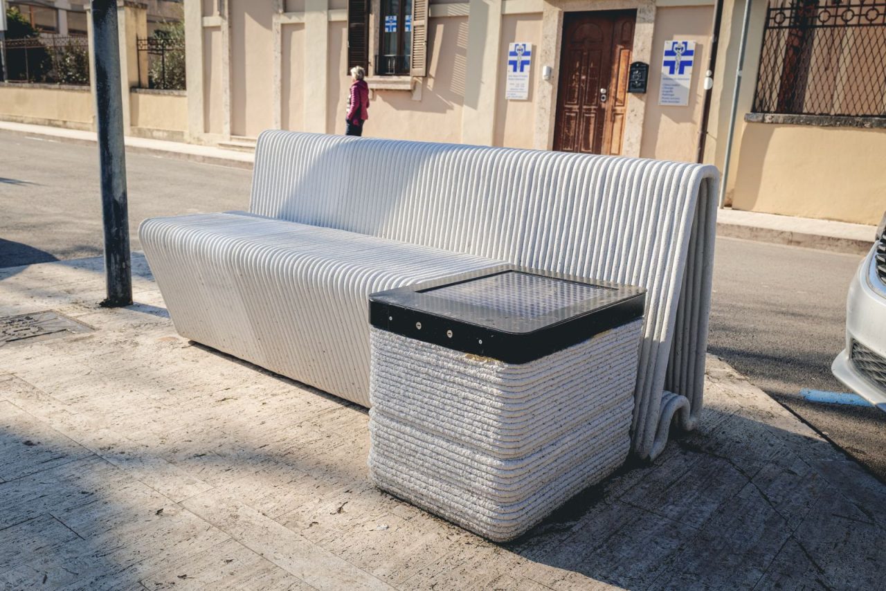 Sono state create attraverso la stampa 3D in calcestruzzo sostenibile, con materiale proveniente da demolizioni. Un progetto realizzato in collaborazione con Centuroos e Panichi Srl. Le panchine sono state realizzate, infatti, grazie al recupero e al riuso di macerie, che altrimenti sarebbero diventate un rifiuto. Sono dotate di un pannello fotovoltaico che alimenta le prese Usb, utili per poter alimentare i dispositivi mobili che tutti usiamo quotidianamente.