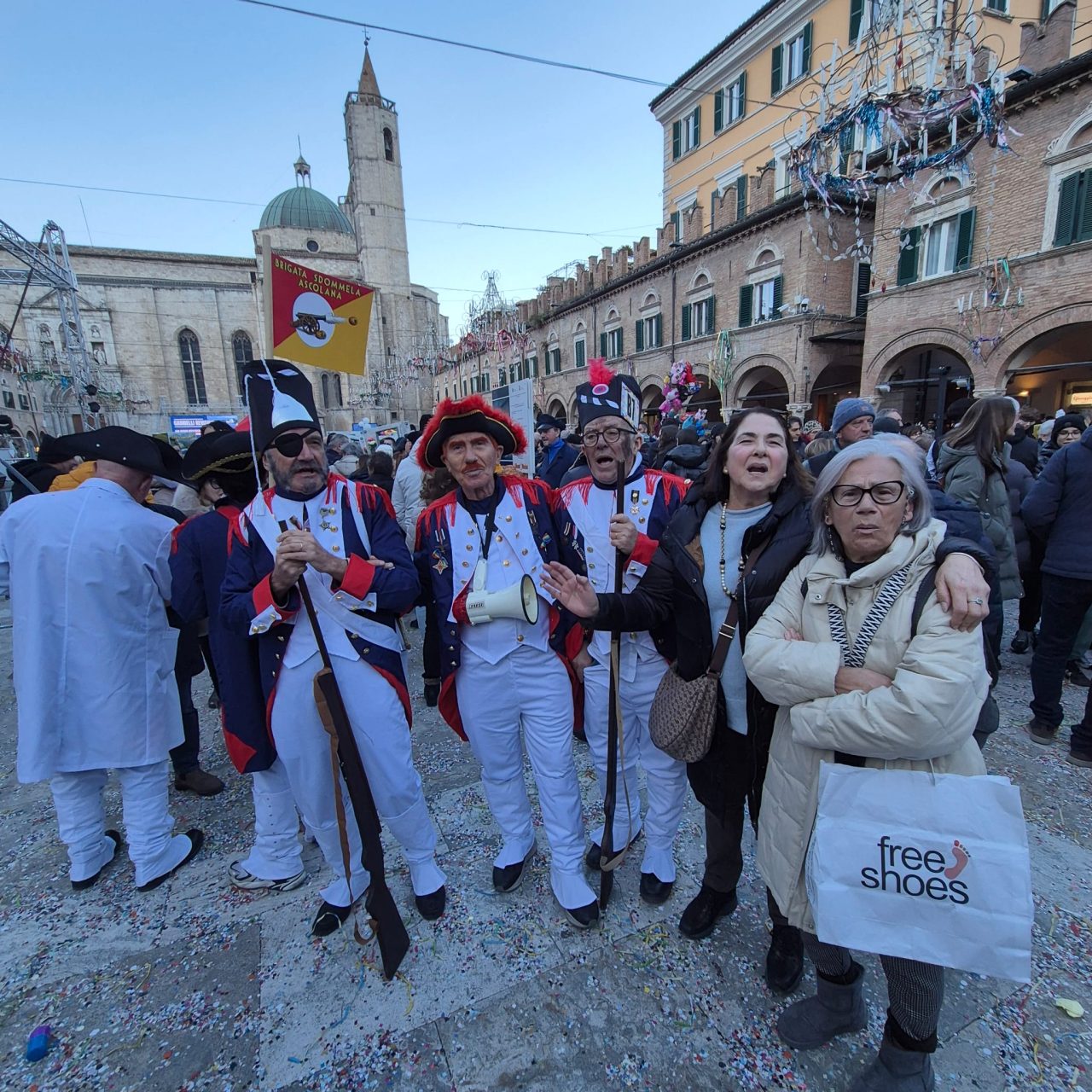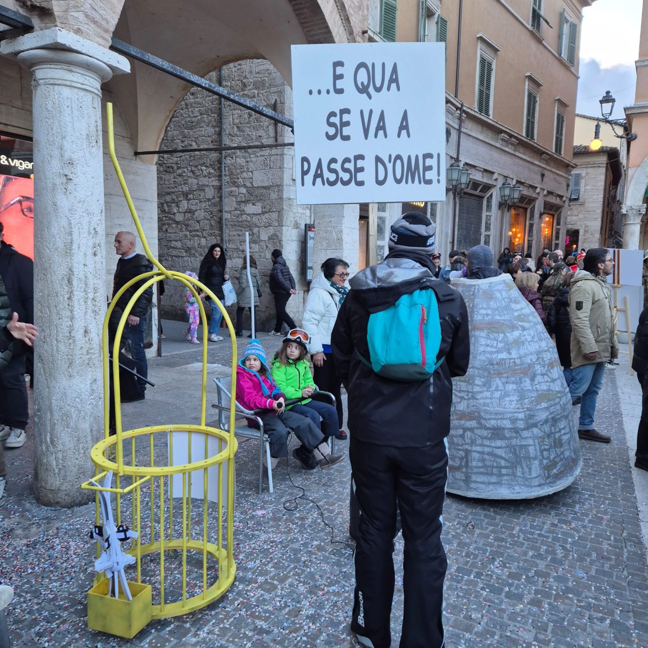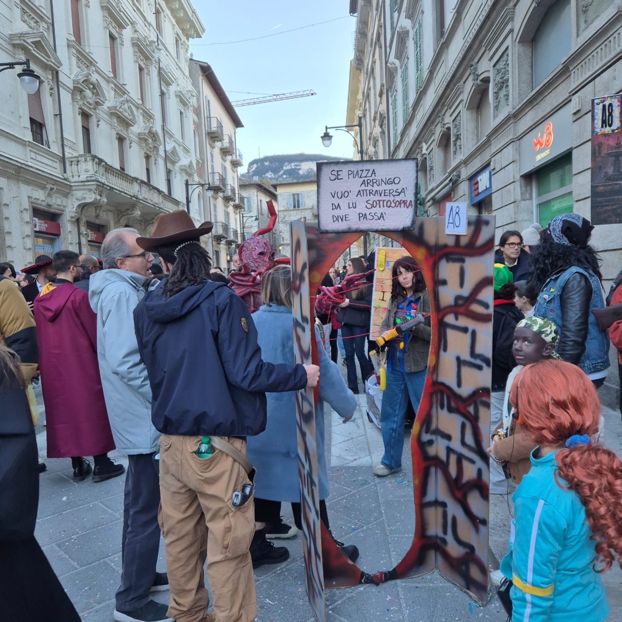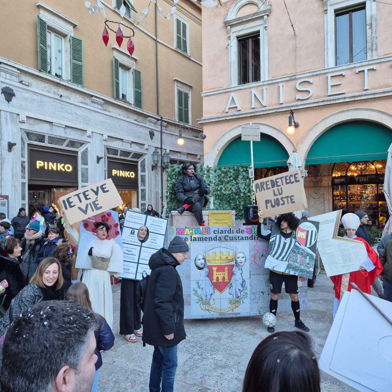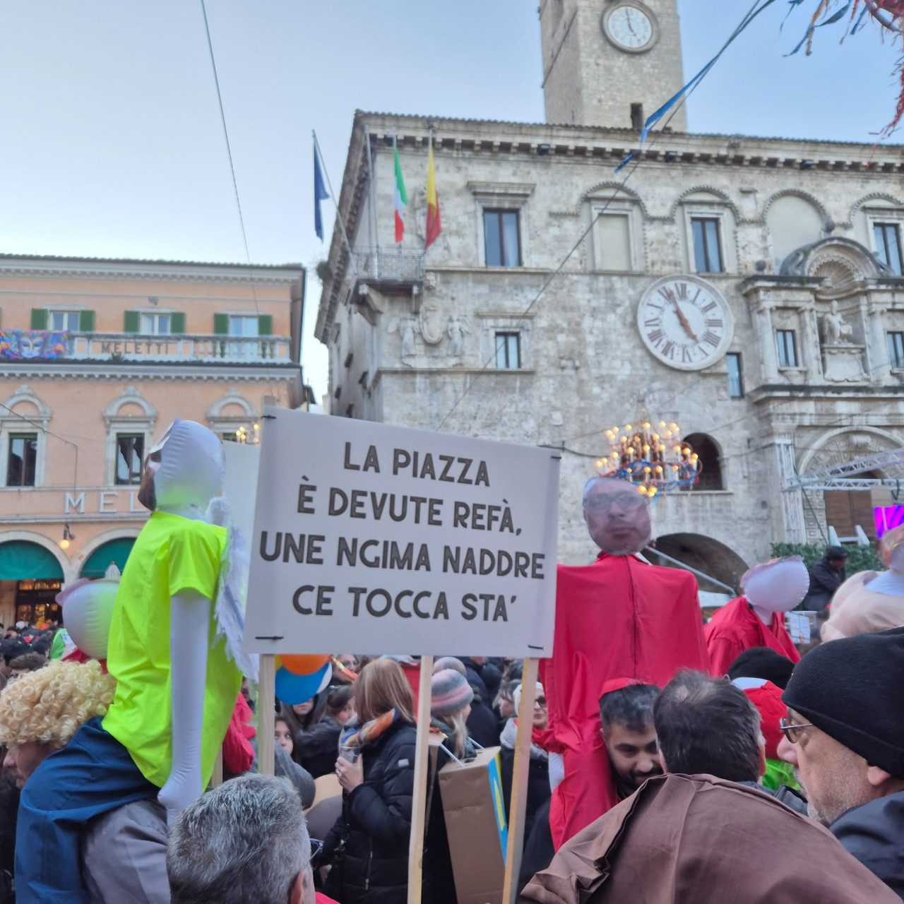 Carnevale ascolano in piazza 2026 con il sole, wow, ma senza Piazza Arringo. Un tema che scotta, e ispira. I lavori in corso, che non si sono fermati neppure oggi, e che la rendono completamente inagibile, è uno dei piatti forti di questa edizione. Restyling, integrazione urbana. Qua si parla difficile.