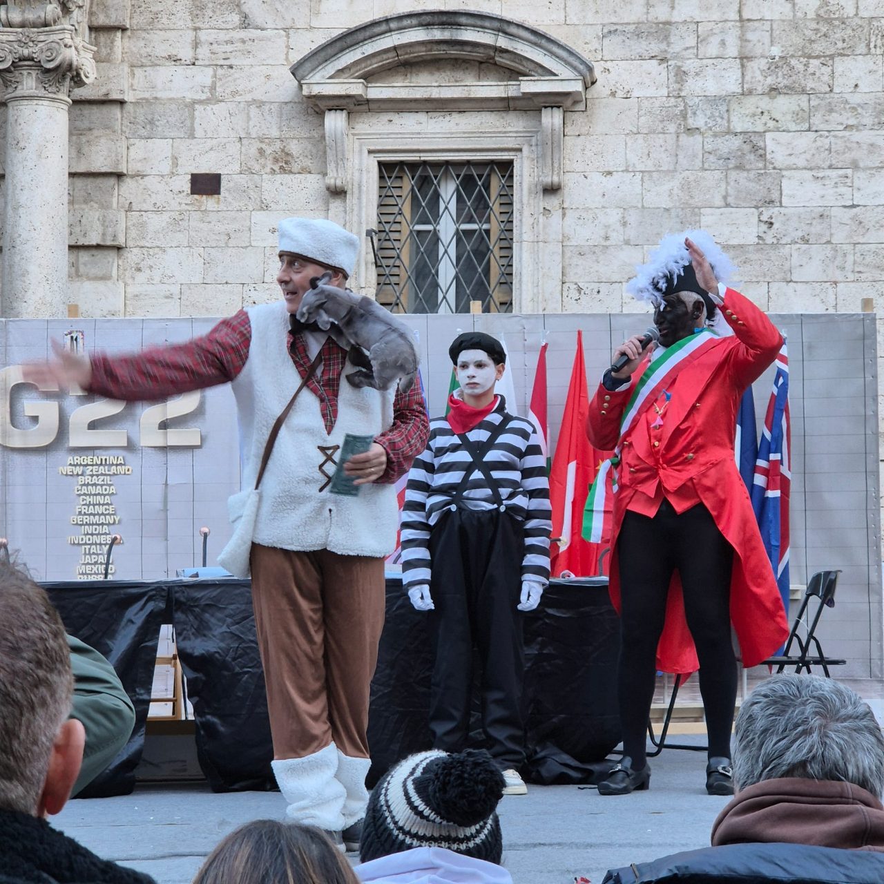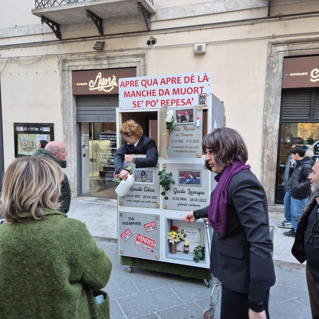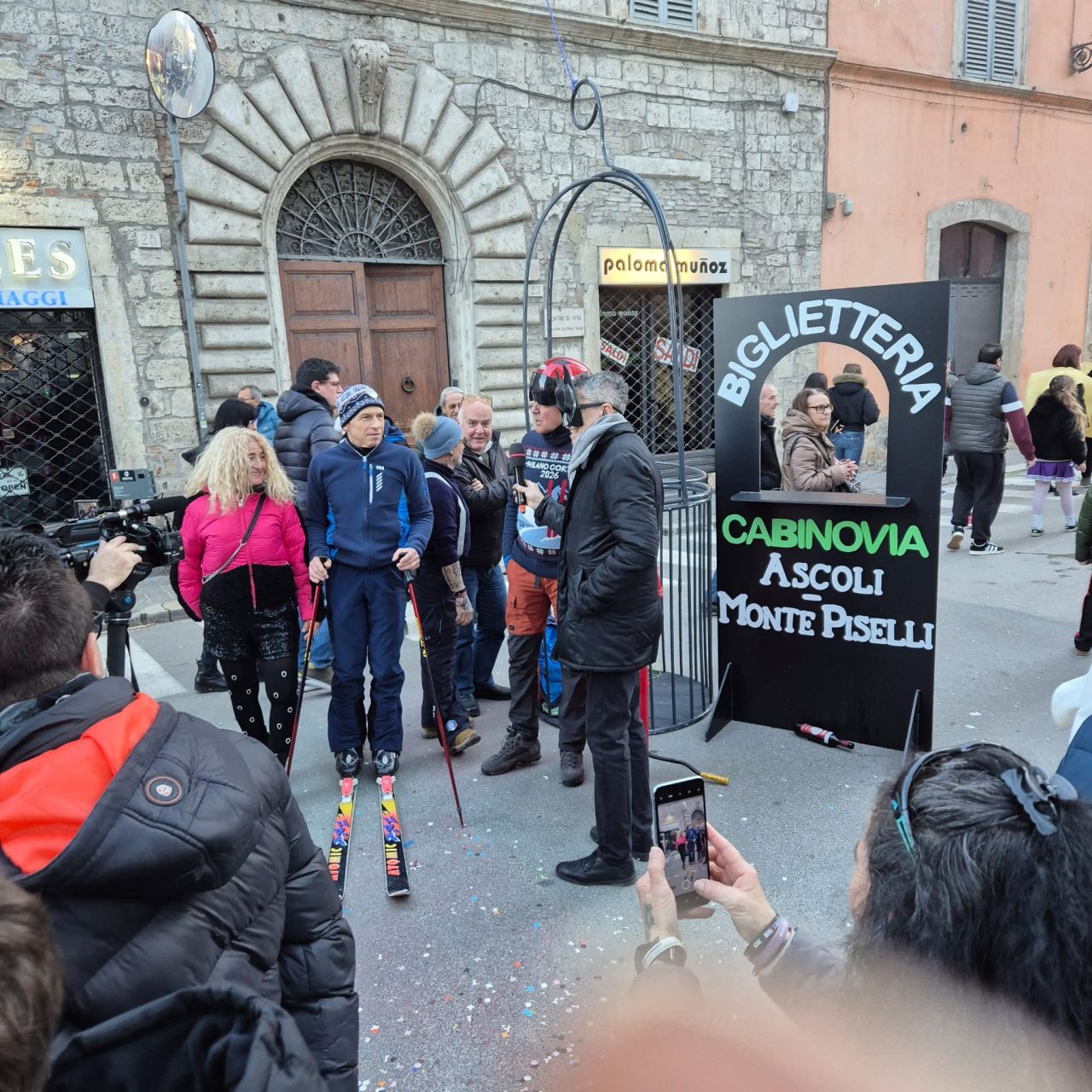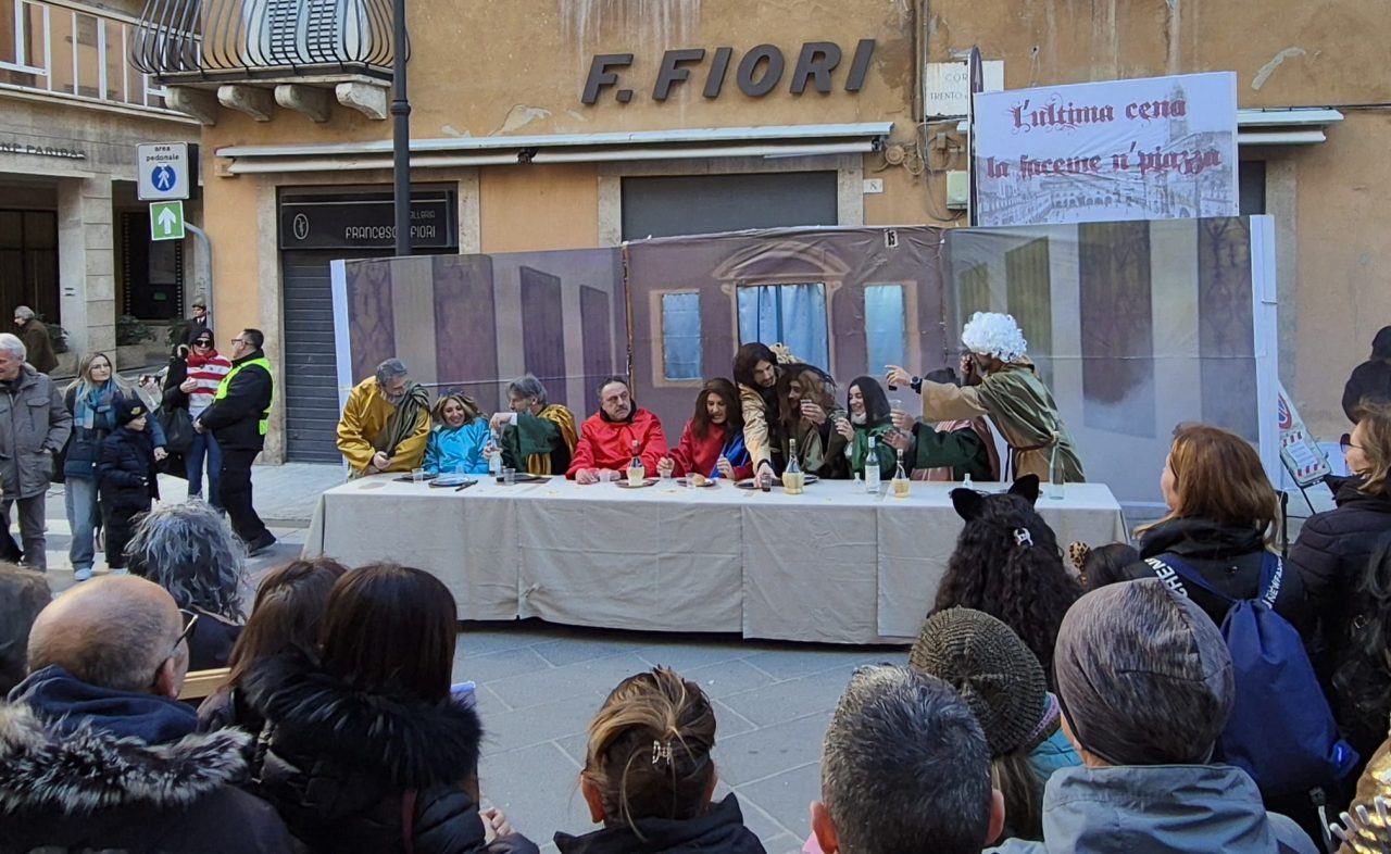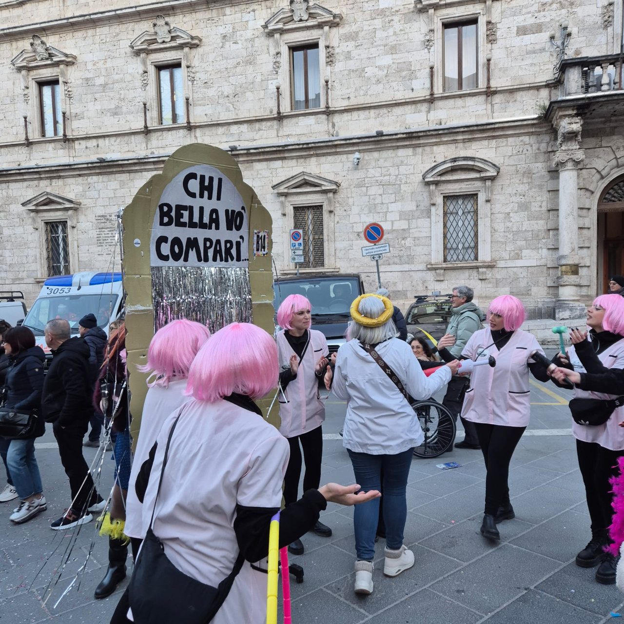 Carnevale ascolano in piazza 2026 con il sole, wow, ma senza Piazza Arringo. Un tema che scotta, e ispira. I lavori in corso, che non si sono fermati neppure oggi, e che la rendono completamente inagibile, è uno dei piatti forti di questa edizione. Restyling, integrazione urbana. Qua si parla difficile.