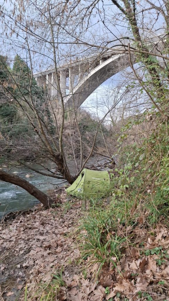 La tenda lungo le sponde del fiume Tronto