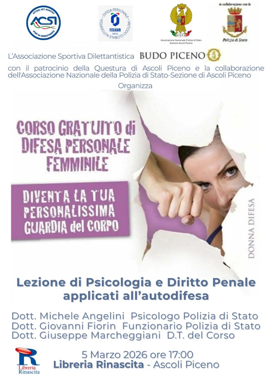 A conclusione del corso di autodifesa femminile “Donna Difesa”, organizzato dall’Asd Budo Piceno con il patrocinio e la collaborazione della Questura di Ascoli Piceno e della locale sezione dell’associazione nazionale Polizia di Stato, si terrà giovedì 5 marzo alle ore 17 , presso la Libreria Rinascita di Ascoli Piceno, in Piazza Roma, un incontro pubblico di approfondimento.