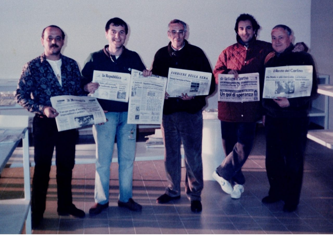 Il team dopo l’acquisizione della diffusione di San Benedetto nel 1990. Gli Angelini sono il terzo e il quarto da sinistra