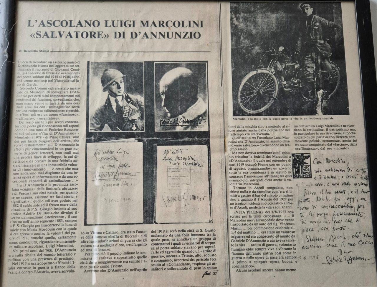 Pochi sanno che lo zio di Carlo Angelini, Luigi Marcolini, classe 1895, era riuscito a guadagnarsi l’amicizia e la riconoscenza di Gabriele D’Annunzio. Ne abbiamo notizie certe grazie ad un articolo di Benedetto Marini pubblicato sulla benemerita rivista di vita ascolana Flash. Luigi, infatti, da giovane ardito nella Grande Guerra, aveva salvato il Vate nel 1919 a San Giusto, dalla accesa contestazione di un gruppo di cittadini triestini. Forte della sua stazza lo aveva portato, di peso, al sicuro, con l’aiuto della Polizia nel frattempo accorsa.